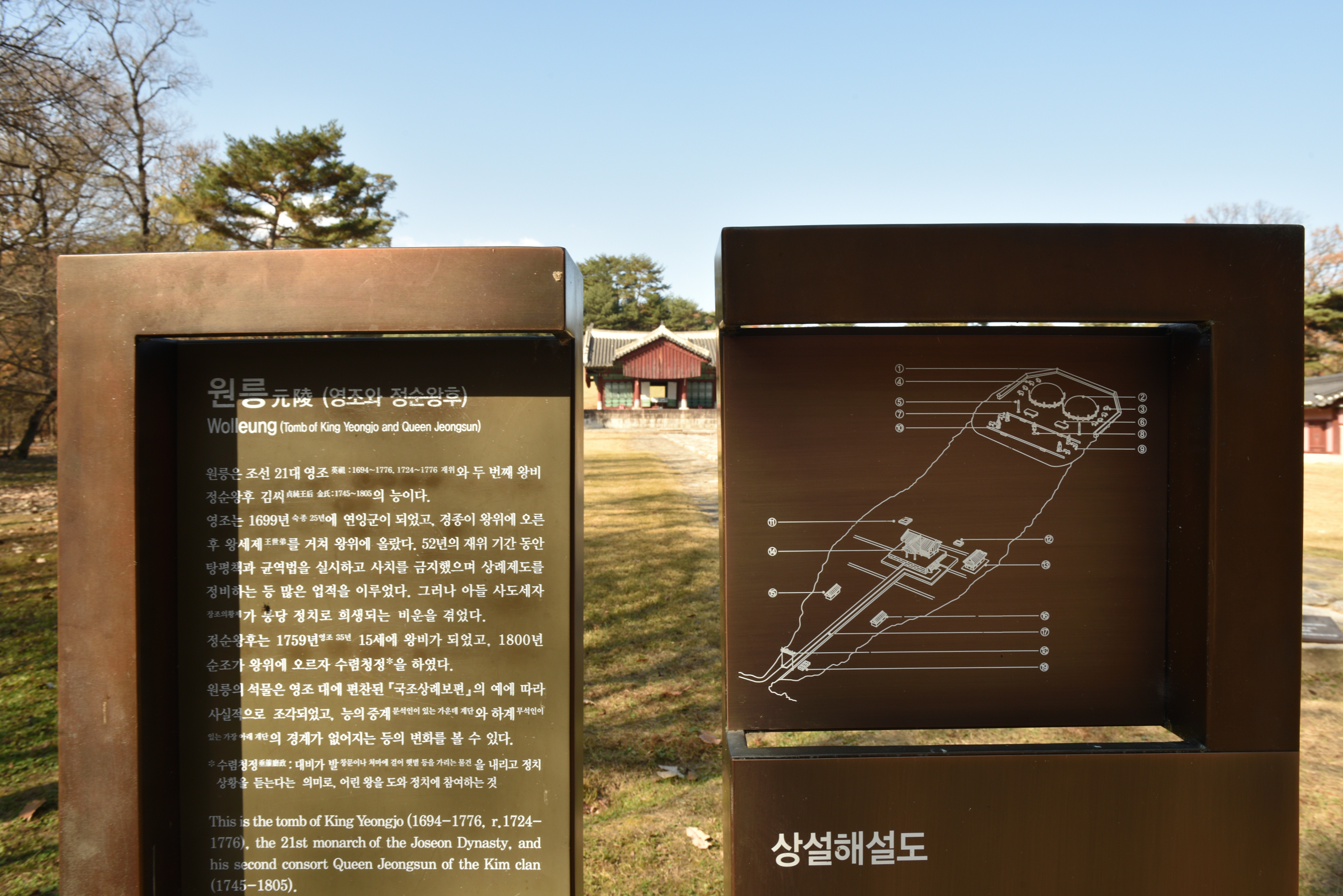 원릉 - 21대 영조와 영조의 두 번째 왕비 정순왕후 김씨의 능. 정순왕후는 경주김씨로 충남 서산시 음암면에서 태어났으며 추사 김정희의 증대고모뻘이다. 1759년인 영조 35년에 15세의 나이에 왕비가 되었고, 정조 사후 1800년 순조가 11세의 나이로 왕위에 오르자 대왕대비가 되어 왕실 최고 어른으로서 3년간 수렴청정을 하게 되었다. 이때 국정을 주도하면서 조정의 주요 신하들로부터 개인별 충성 서약을 받았다. 신유박해를 주도하고, 정조가 만든 근위병인 장용영을 폐지하며 규장각을 축소시키고, 공노비를 혁파(革罷)하였다. 1805년 창덕궁에서 60세로 사망하였다.
