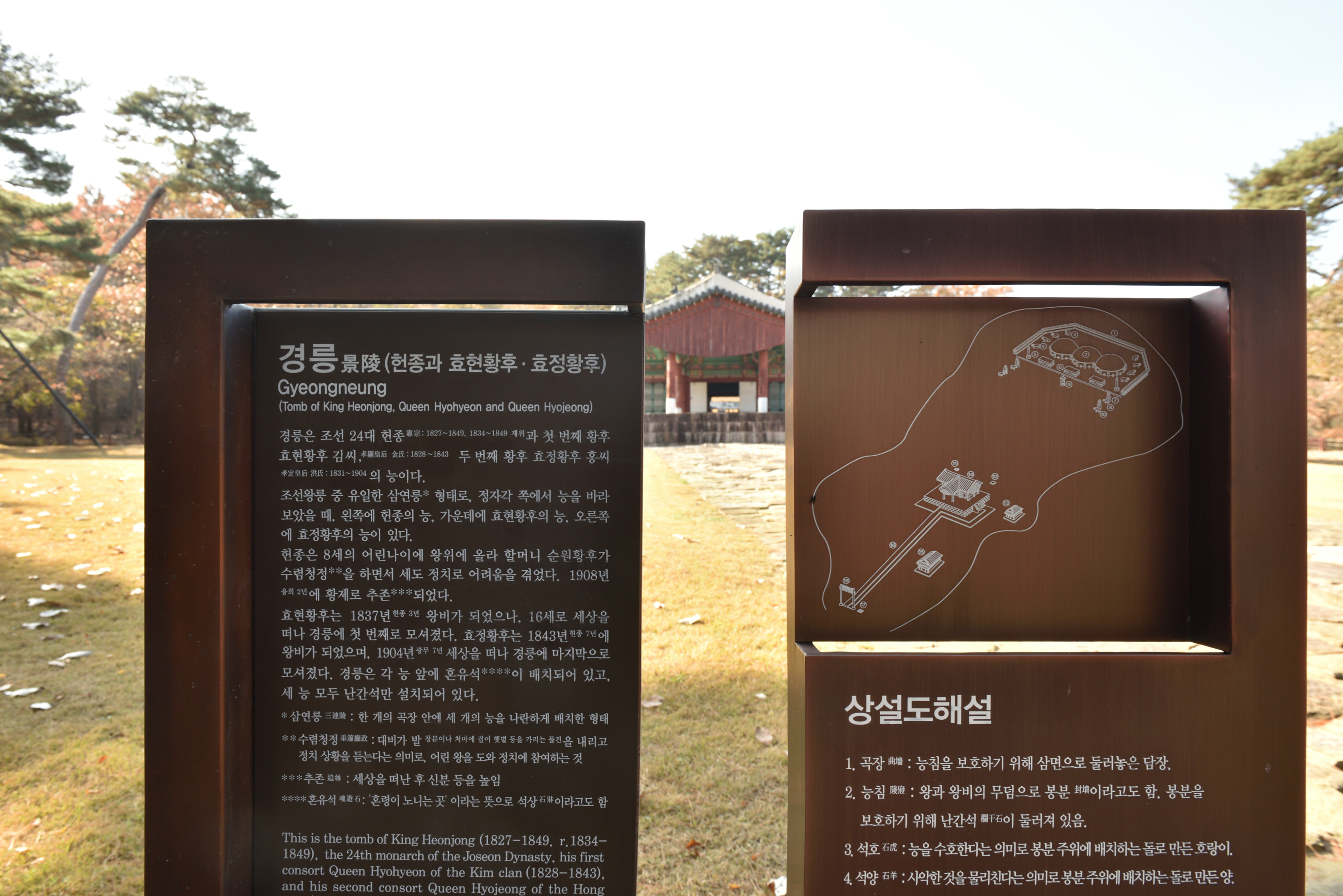 경릉 - 조선 24대 헌종과 효현왕후, 효정왕후의 능. 왼쪽부터 헌종 효현왕후 효정왕후 순으로 3기가 나란히 안장되어 있다. 헌종은 순조의 유일한 친손자이자 효명세자의 하나뿐인 외아들로 아버지인 세자가 22세의 나이로 갑작스럽게 요절하고, 할아버지 순조마저 건강 악화로 일찍 세상을 떠나자 왕세손(王世孫)의 신분으로 8세의 어린 나이에 국왕이 되었는데 조선 왕으로서는 최연소로서, 10세에 즉위한 할아버지 순조와 단종보다도 어린 나이에 즉위했으나 그 역시 23세로 후사없이 요절하였다. 순조의 정비이자 할머니인 왕대비 순원왕후 김씨가 수렴청정을 실시했다. 어머니는 풍양조씨 신정왕후로 철종 사후 안동김씨의 세도를 견제하고 풍양조씨들을 등용시키고자 이하응의 어린 아들을 고종으로 즉위시켜 4년간 수렴청정을 하였고 요절한 아버지 문조의 뒤를 이어 수릉에 안장되었다.