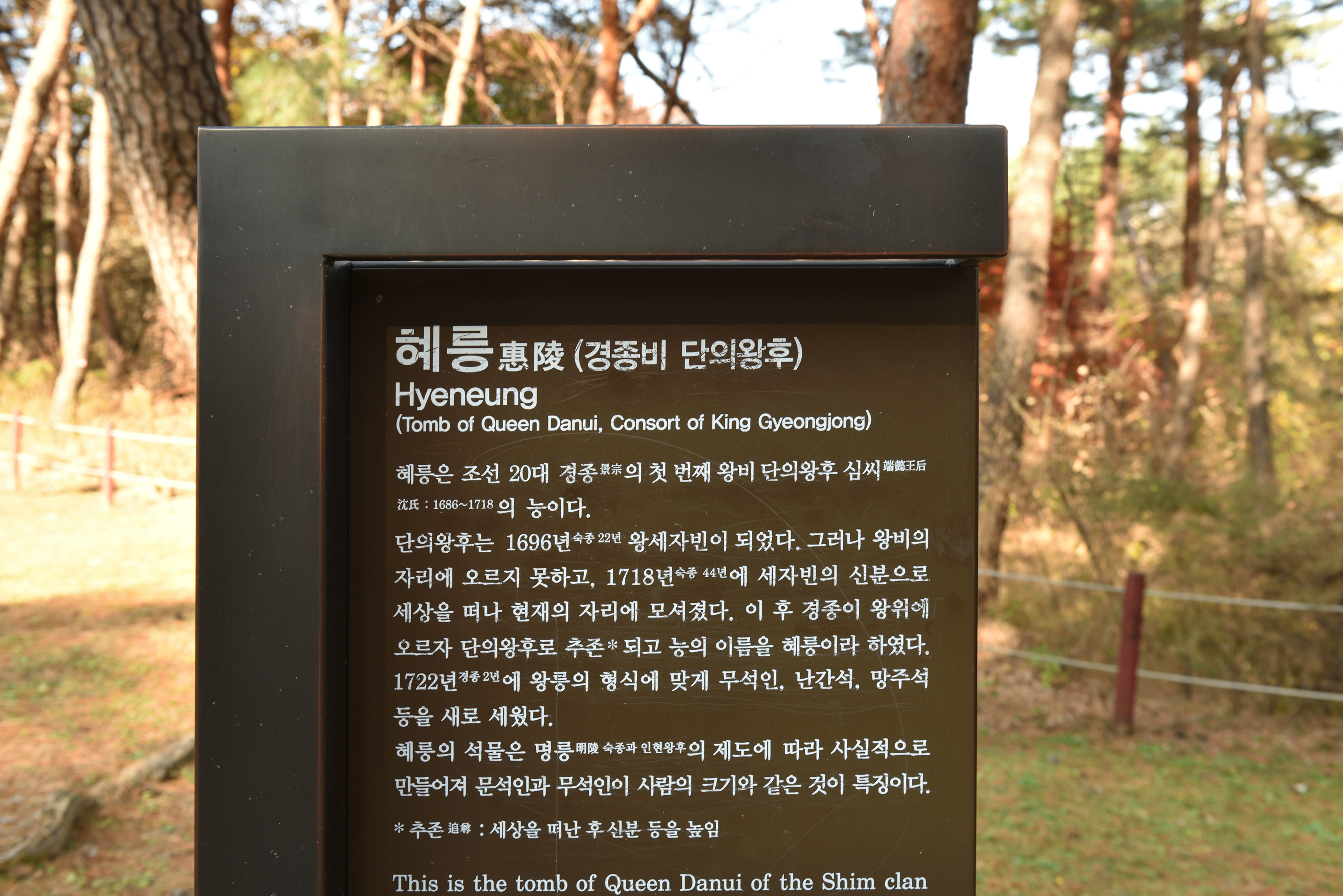 혜릉 - 20대 경종의 첫 째 왕비 단의왕후 심씨의 능. 세종대왕의 국구인 심온의 12대손이며 1696년(숙종 22) 10세의 나이로 세자빈에 책봉되었으나, 경종이 즉위하기 2년 전에 자식 없이 33세 나이로 병사하였다. 1720년 경종이 즉위하자 왕후에 추봉되어 전호는 영휘라 했으며, 1726년(영조 2)에 공효정목이라는 휘호가 추상되었다.