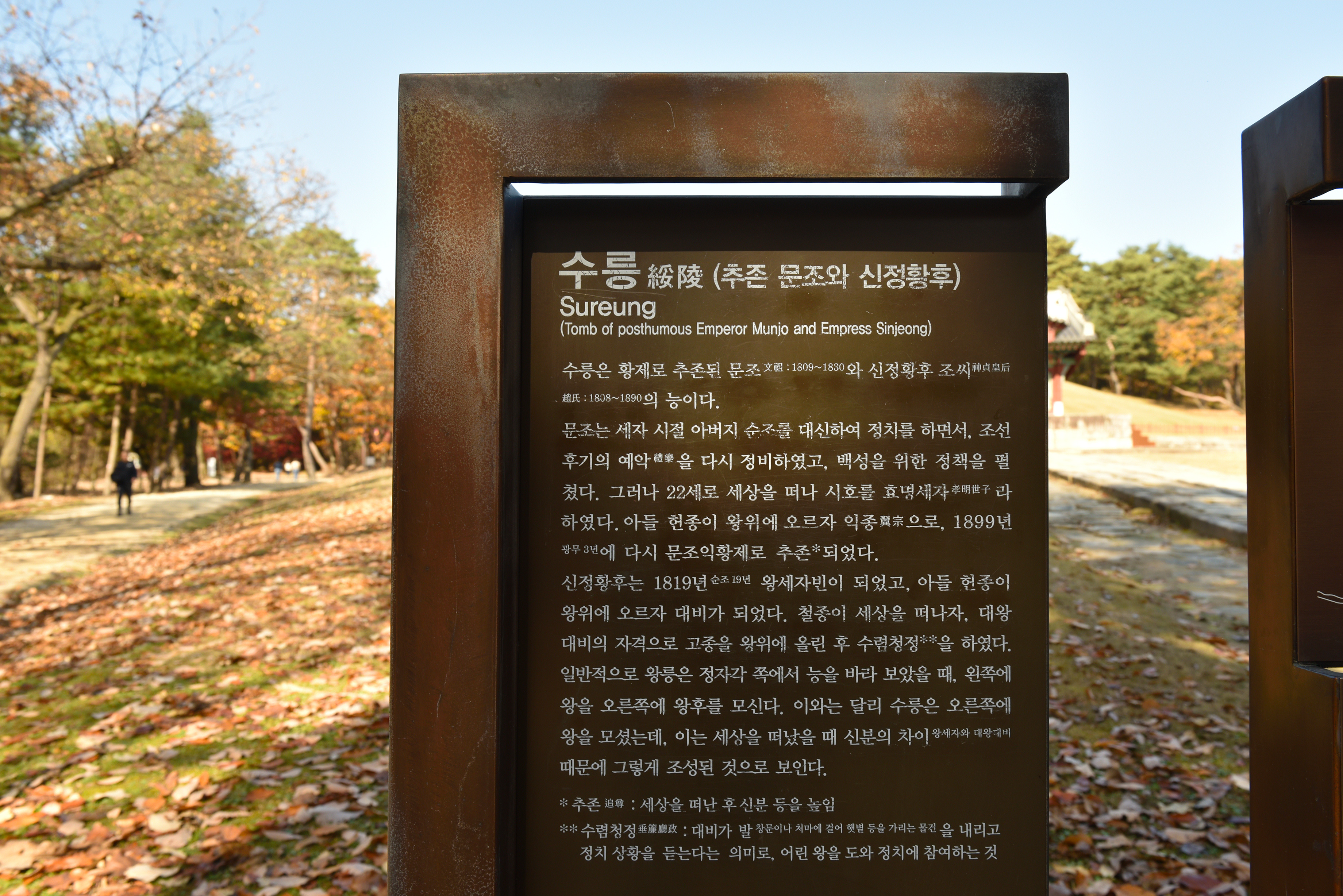수릉 - 문조익황제와 신정왕후의 능(순조의 아들, 효명세자로 22세에 사망 , 아들 24대 헌종이 8세로 즉위하자 익종으로, 대한제국 광무 3년 1889년 다시 문조익황제로 추존되었다. 신정왕후 조씨는 남편 사망 후 대비가 되었고, 철종 사후 이하응과 결탁하여 고종을 즉위시킨 후 4년간 수렴청정으로 정사에 관여하며 풍양조씨의 중흥을 꾀하며 경복궁 중건 등을 이하응과 협의하였다. 수렴청정 이후 조용히 여생을 보내다가 1890년 83세로 경복궁에서 사망하였다. 정치적 영향력이 컸던 연유로 남편의 왼쪽에 안장하였다. 아들 헌종은 순조의 비인 할머니 순원왕후 김씨의 수렴청정을 받으며 성장했으나 후사 없이 23세로 요절하였다. 이후 철종->고종->순종)