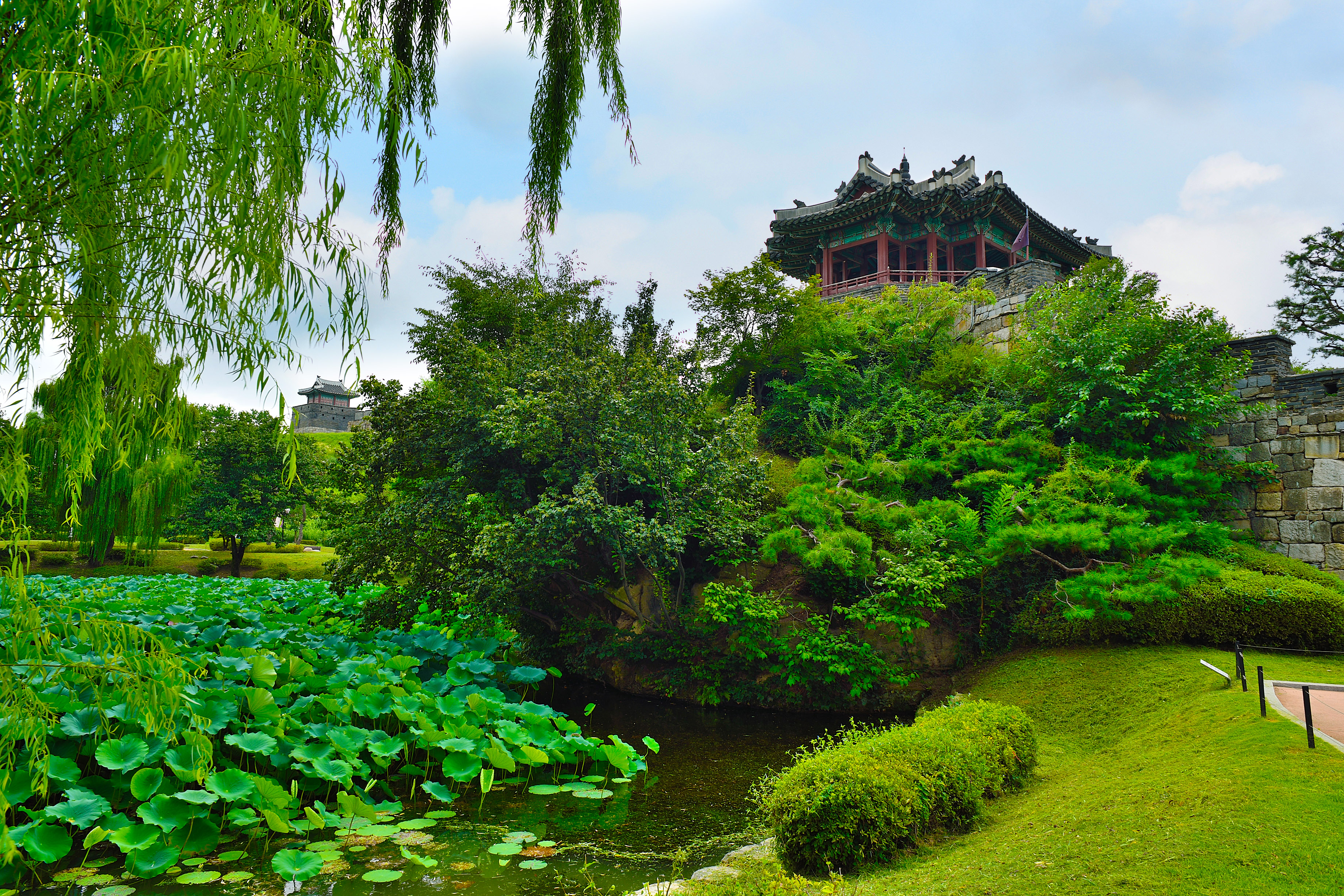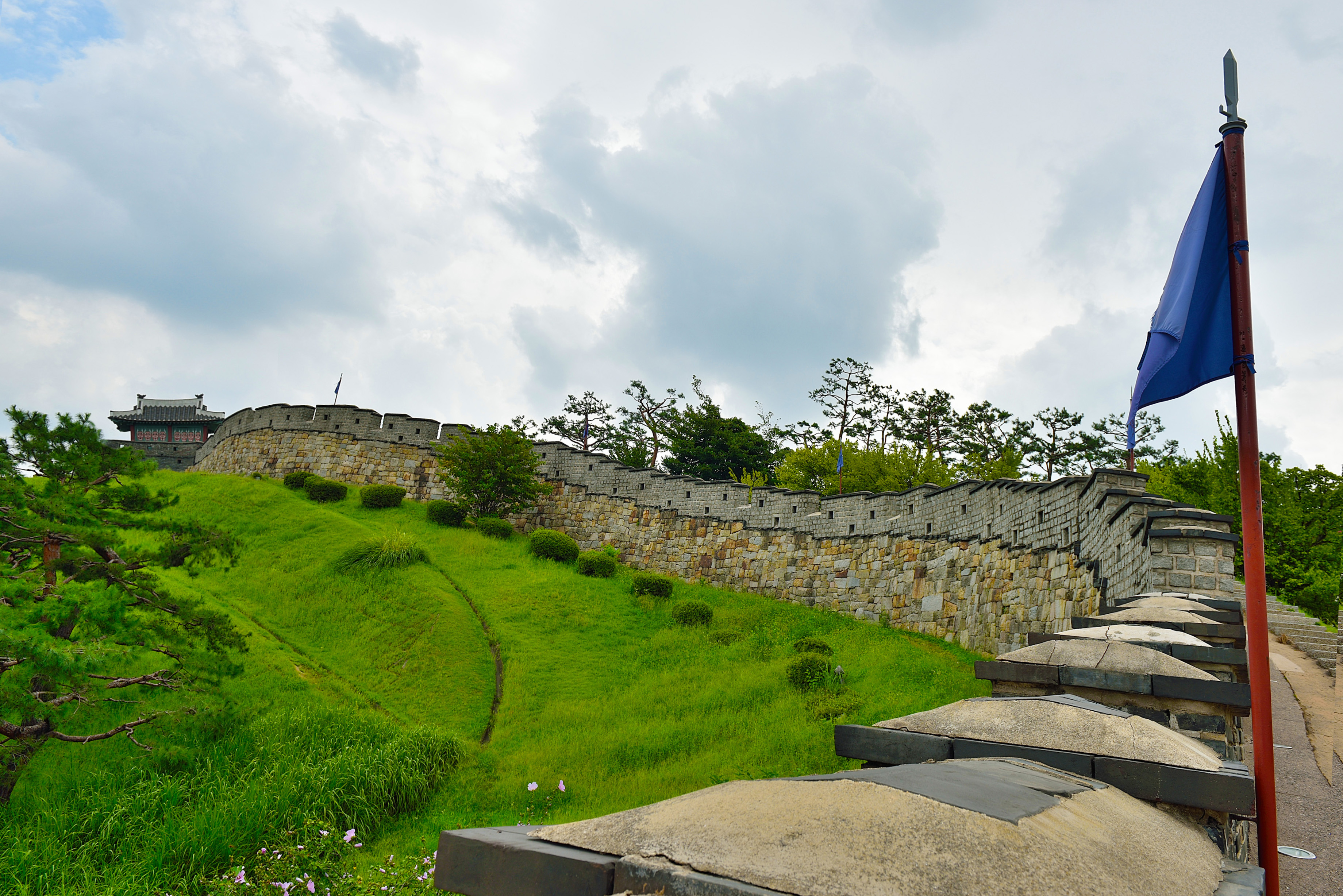 수원천을 건너 다시 방화수류정을 지나는 북쪽 성벽과 동북포루