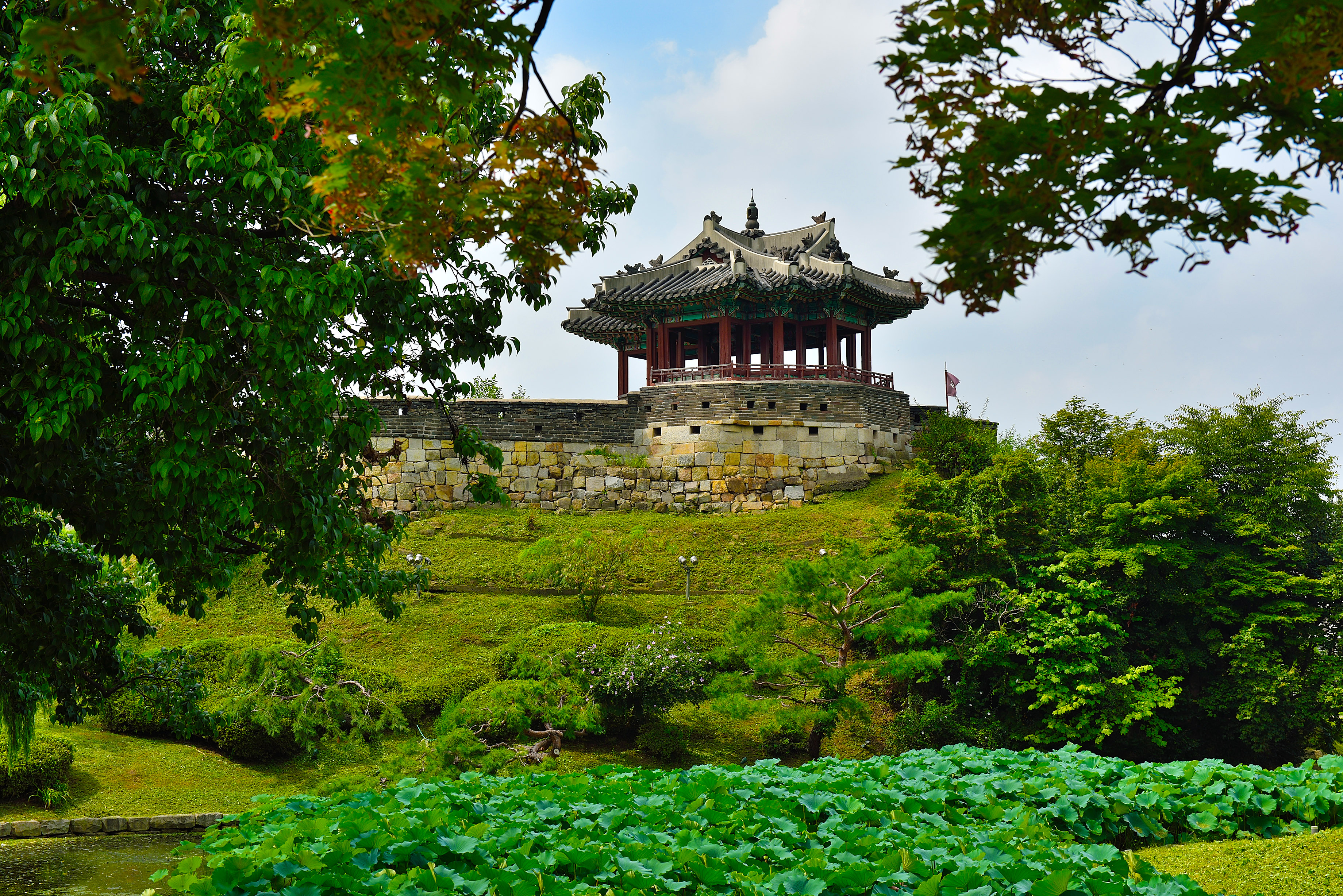 동북포루 성벽 너머 방화수류정과 용연