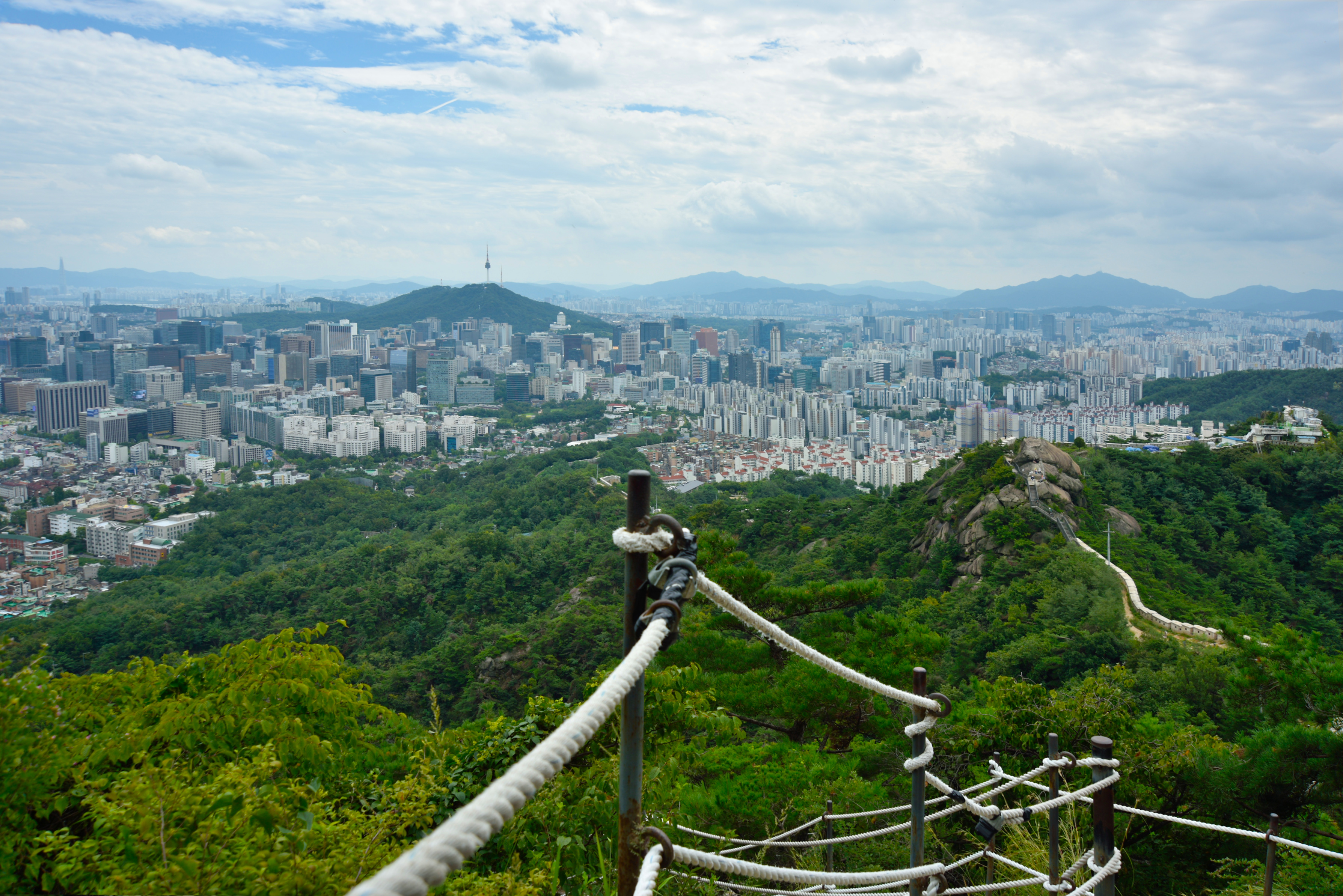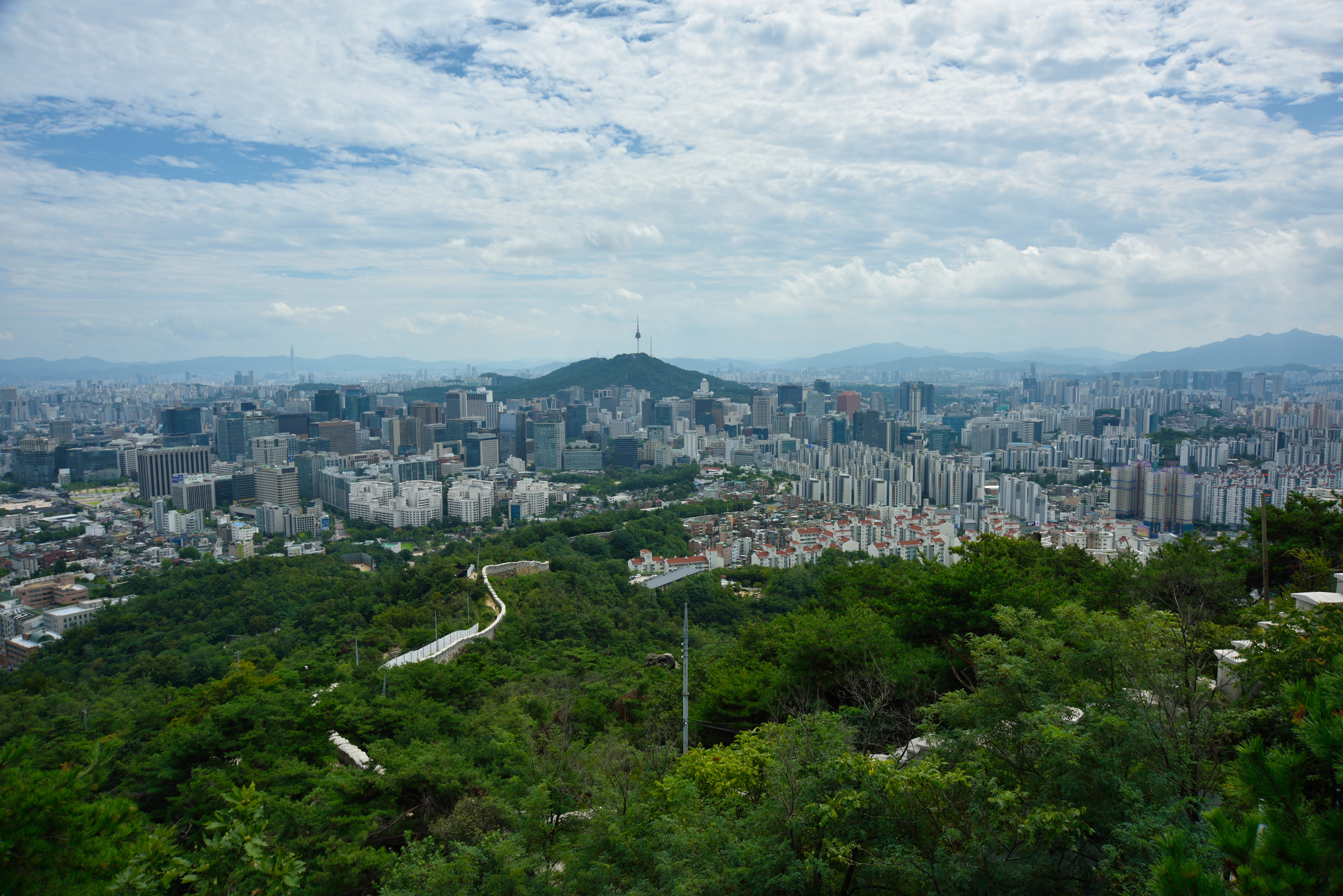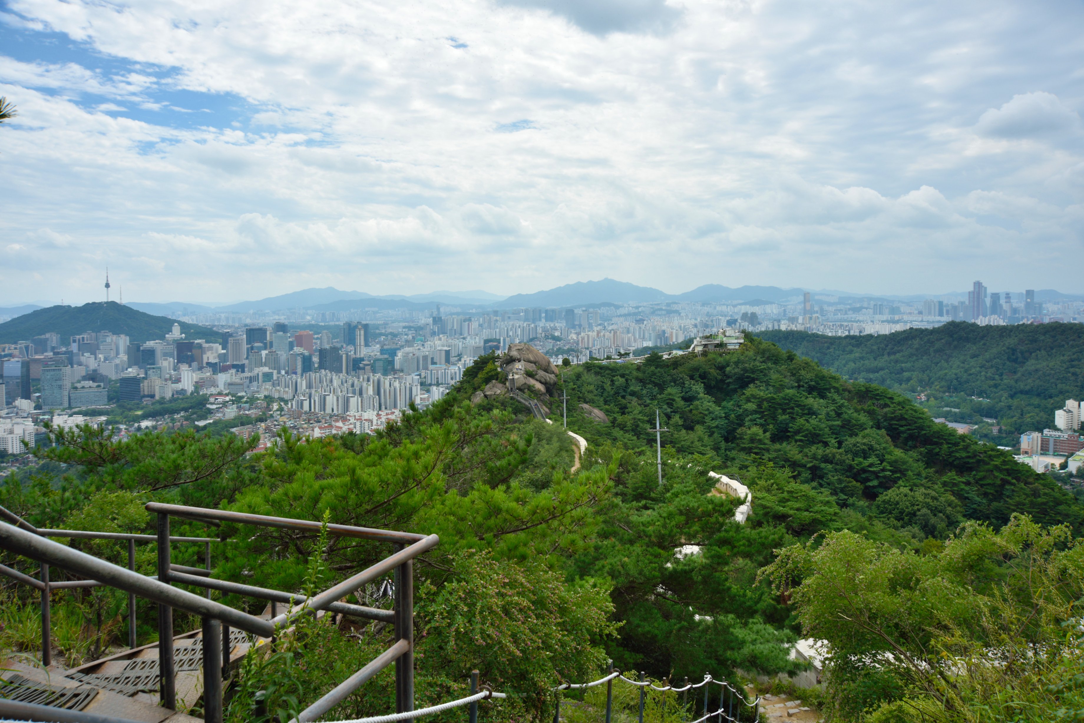 철계단에서 내려다보는 남산, 멀리 청계산과 관악산 사이로 수원 광교산이 보였다.