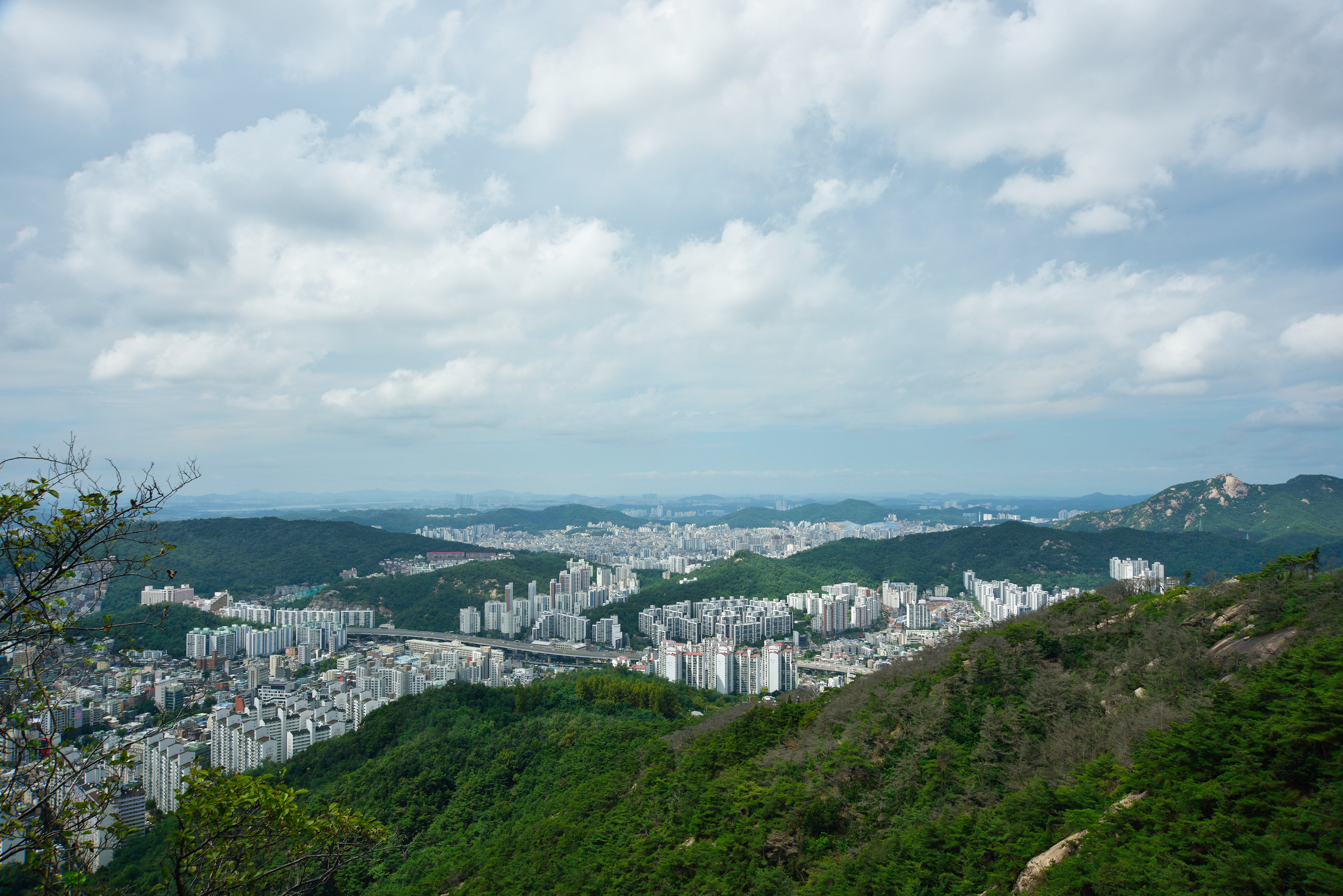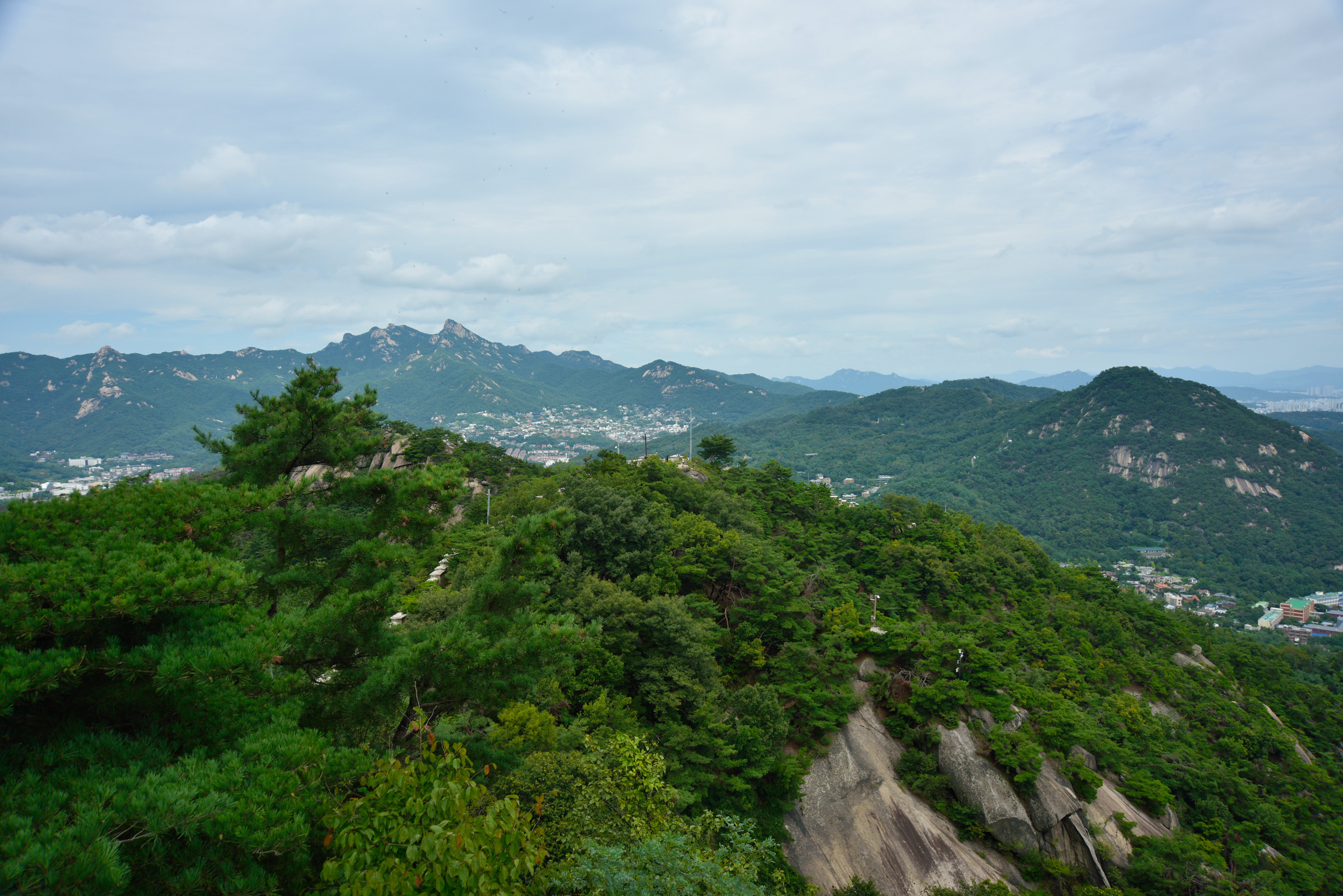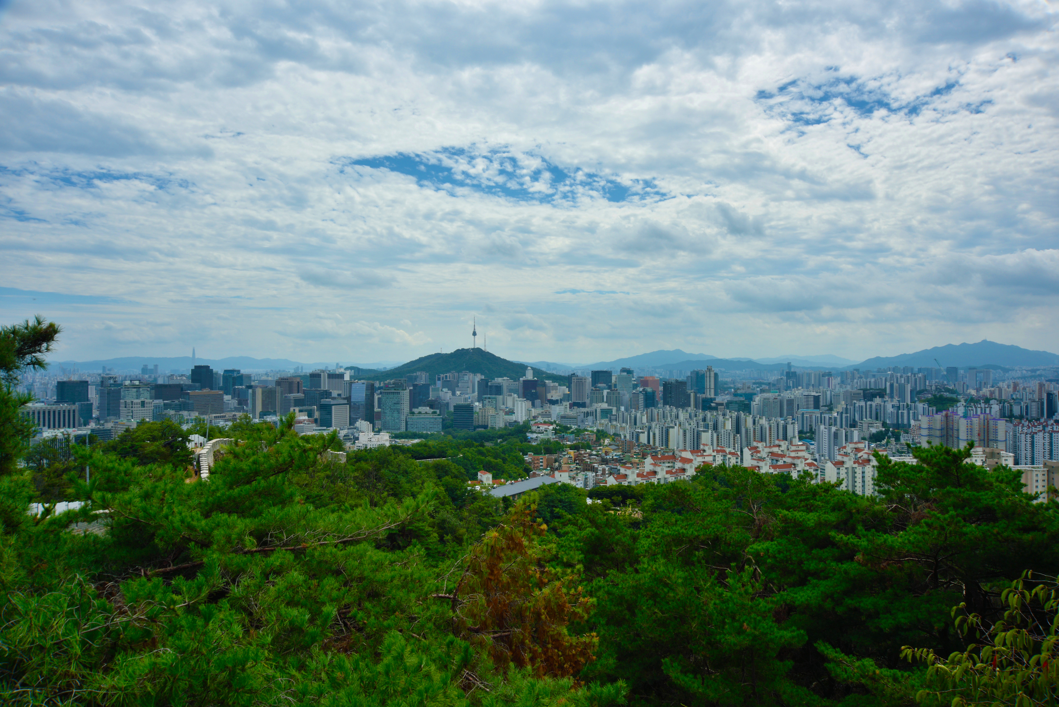 철계단에서 내려다보는 남산, 멀리 청계산과 관악산 사이로 수원 광교산이 보였다.
