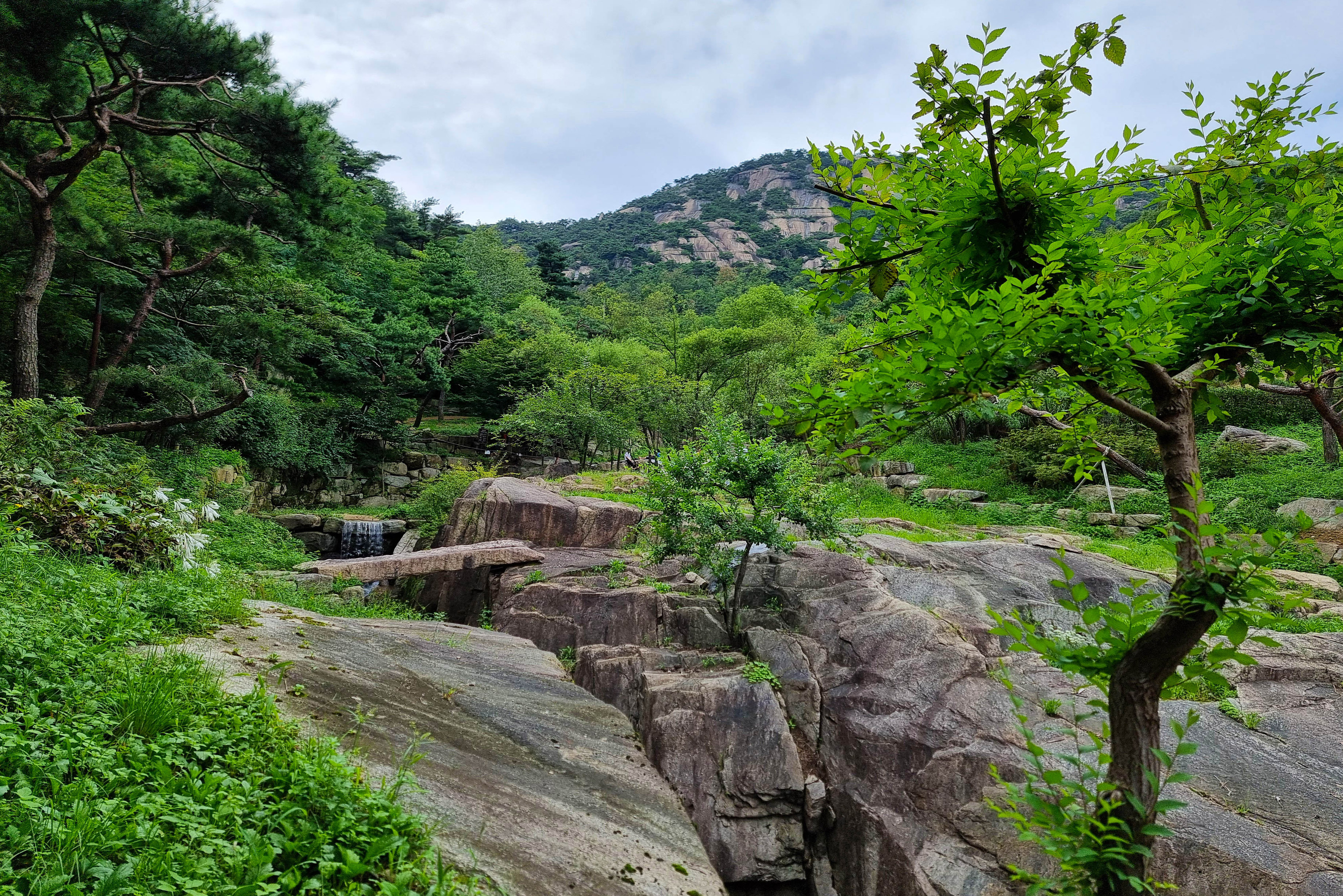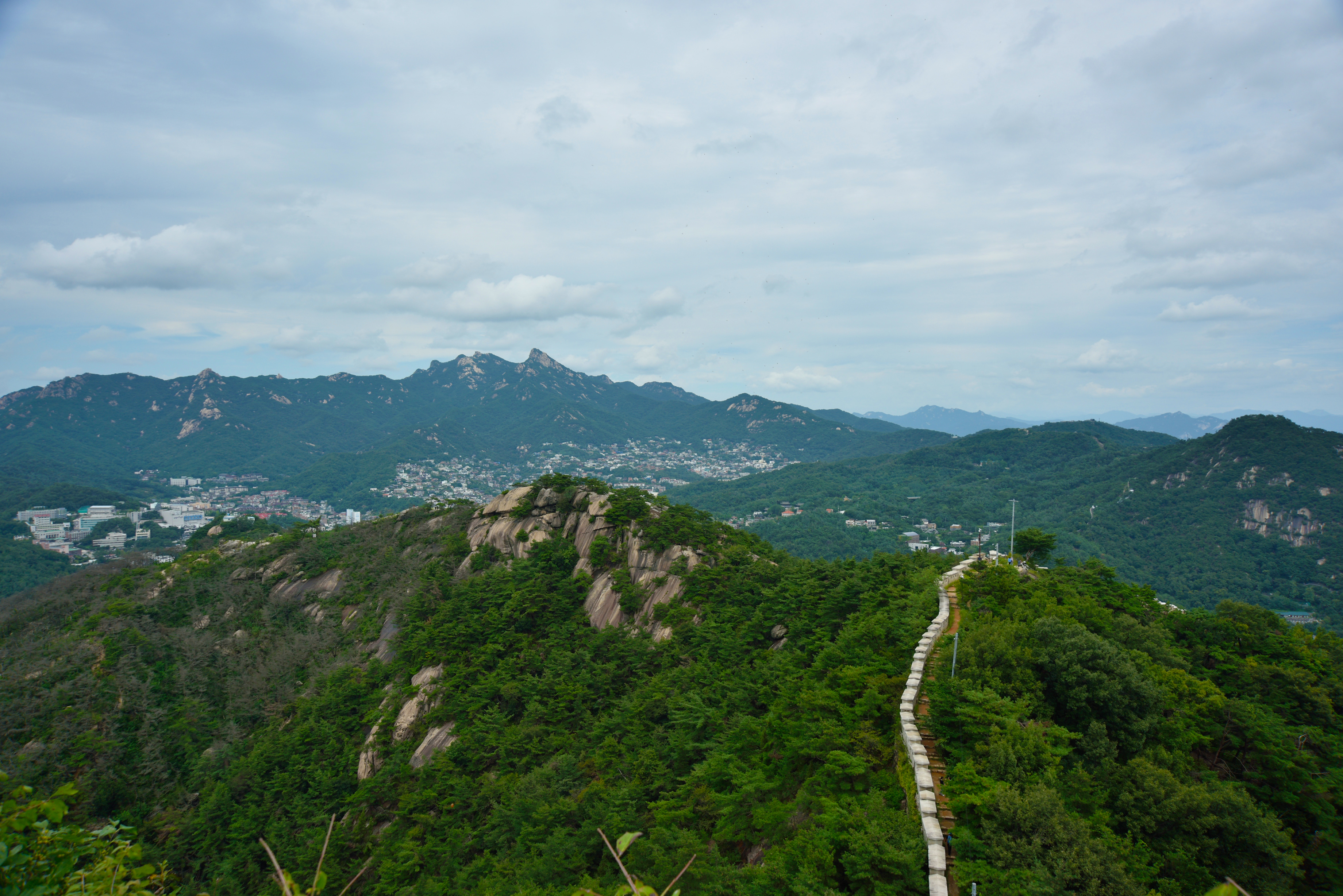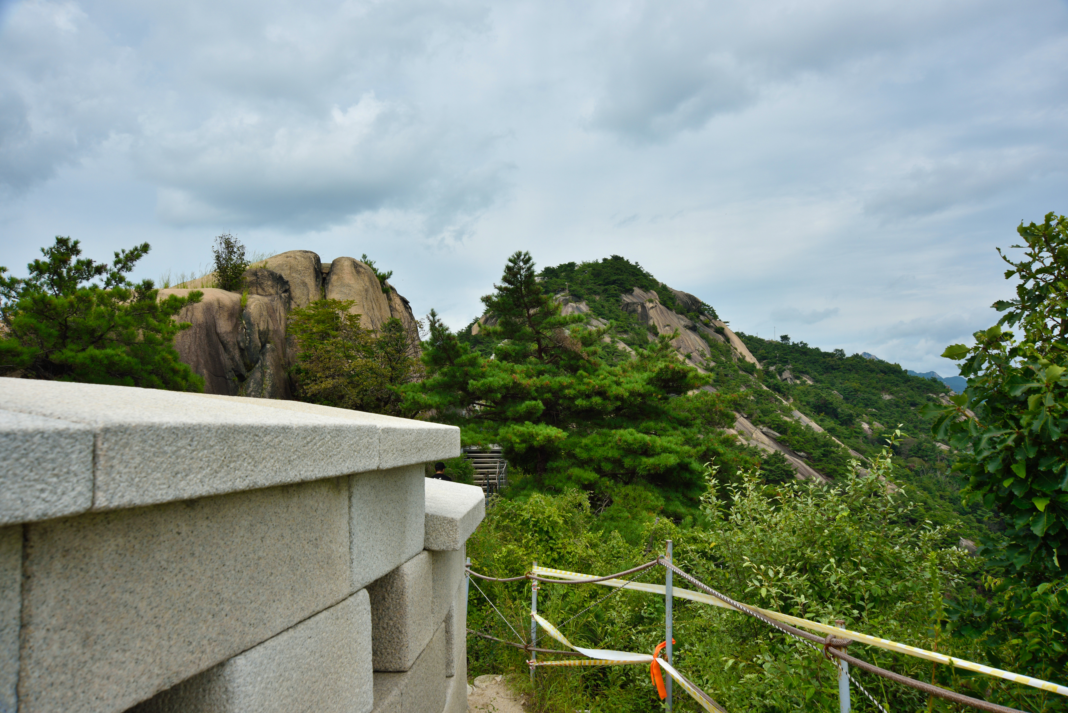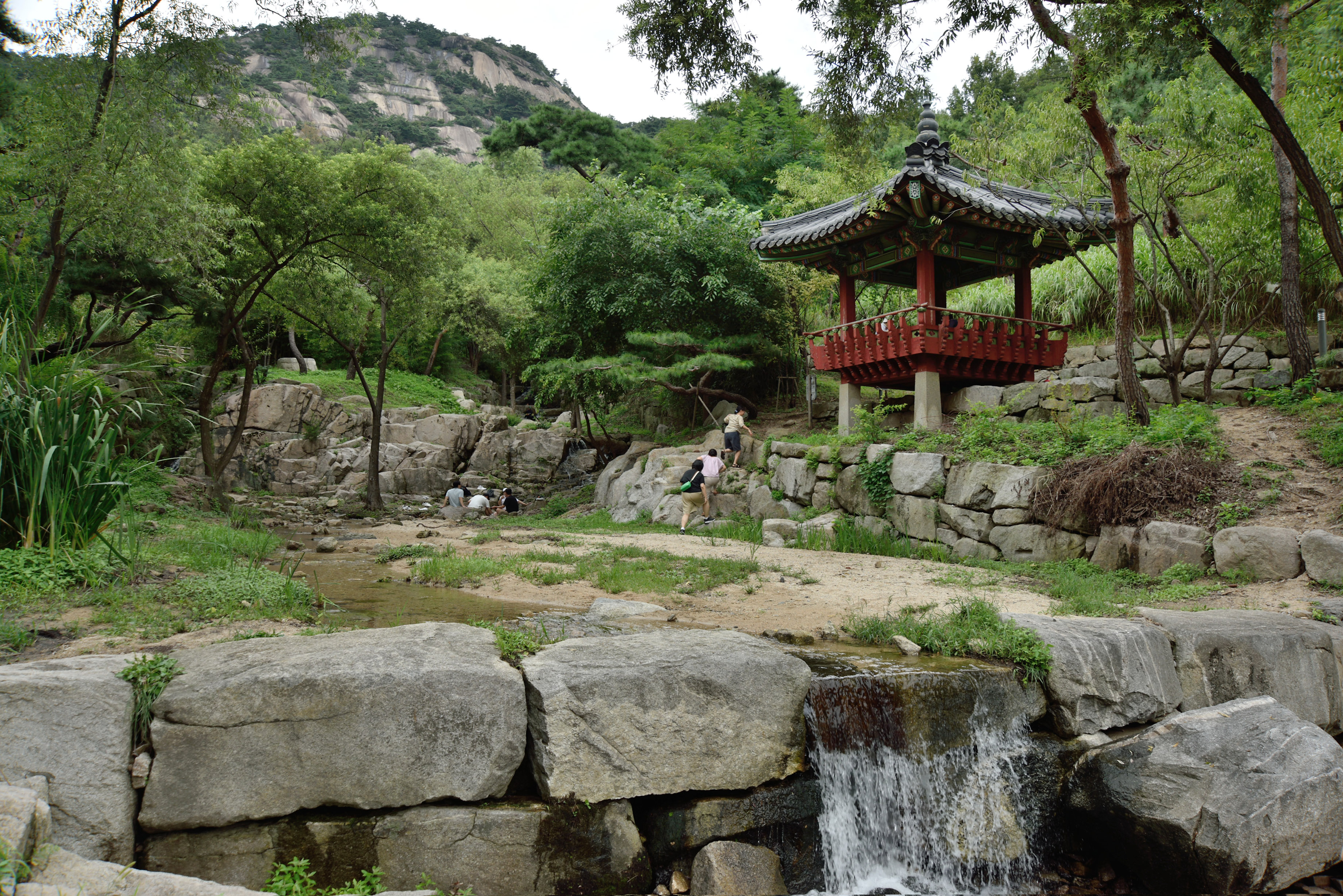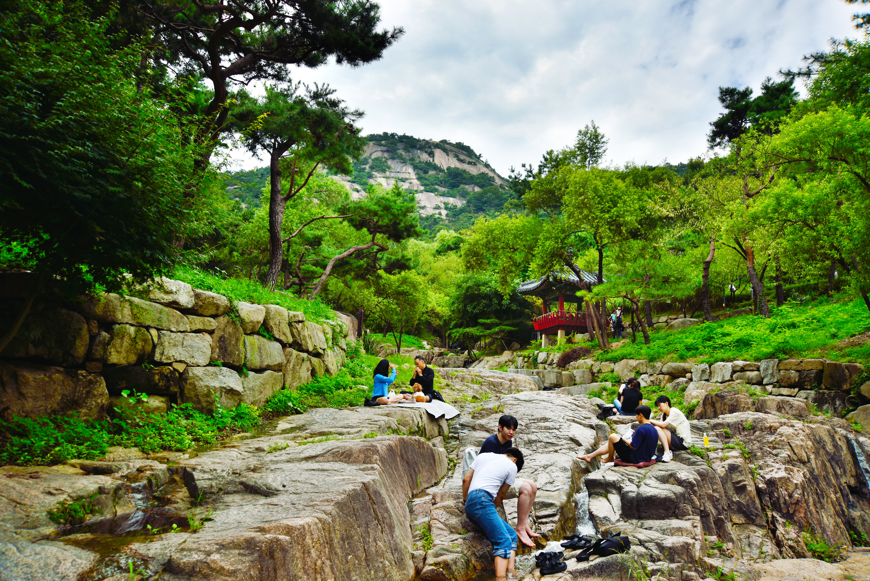 지난번에 올라갔던 길이어서 어렵게 생각하지 않았는데, 가파른 언덕길이라 이내 온몸이 땀에 젖었다. 게다가 성벽길 안쪽으로 모노레일 공사를 하고 있어서 올라가는 풍경이 곱지만은 않았다. 높지 않은 성벽길임에도 가파른 탓에 숨이 차올랐다. 간간이 그늘을 찾아 쉬어갔지만 흐린 날임에도 불구하고 몹시 더웠다. 땀이 흘러 눈에 들어가 눈이 따가웠다. 간간이 트인 곳에서는 성벽 너머 불어오는 북서풍이 시원해서 땀을 말리곤 했다. 마주치는 등산객 중엔 웃으며 인사하는 사람들은 오히려 외국인들이었다. 어떤 이는 오히려 나에게 어디서 왔냐고 물었다. 정상에 올라 잠시 쉬려다가 그늘이 없어 이내 숙정문 방향으로 하산하여 예전처럼 수성동 계곡으로 내려왔다. 인왕산 맑은 계곡물에 사람들이 삼삼오오 물놀이를 하고 있었다. 나도 잠시 물가에 앉아 발을 담그며 지친 다리를 달래었다.