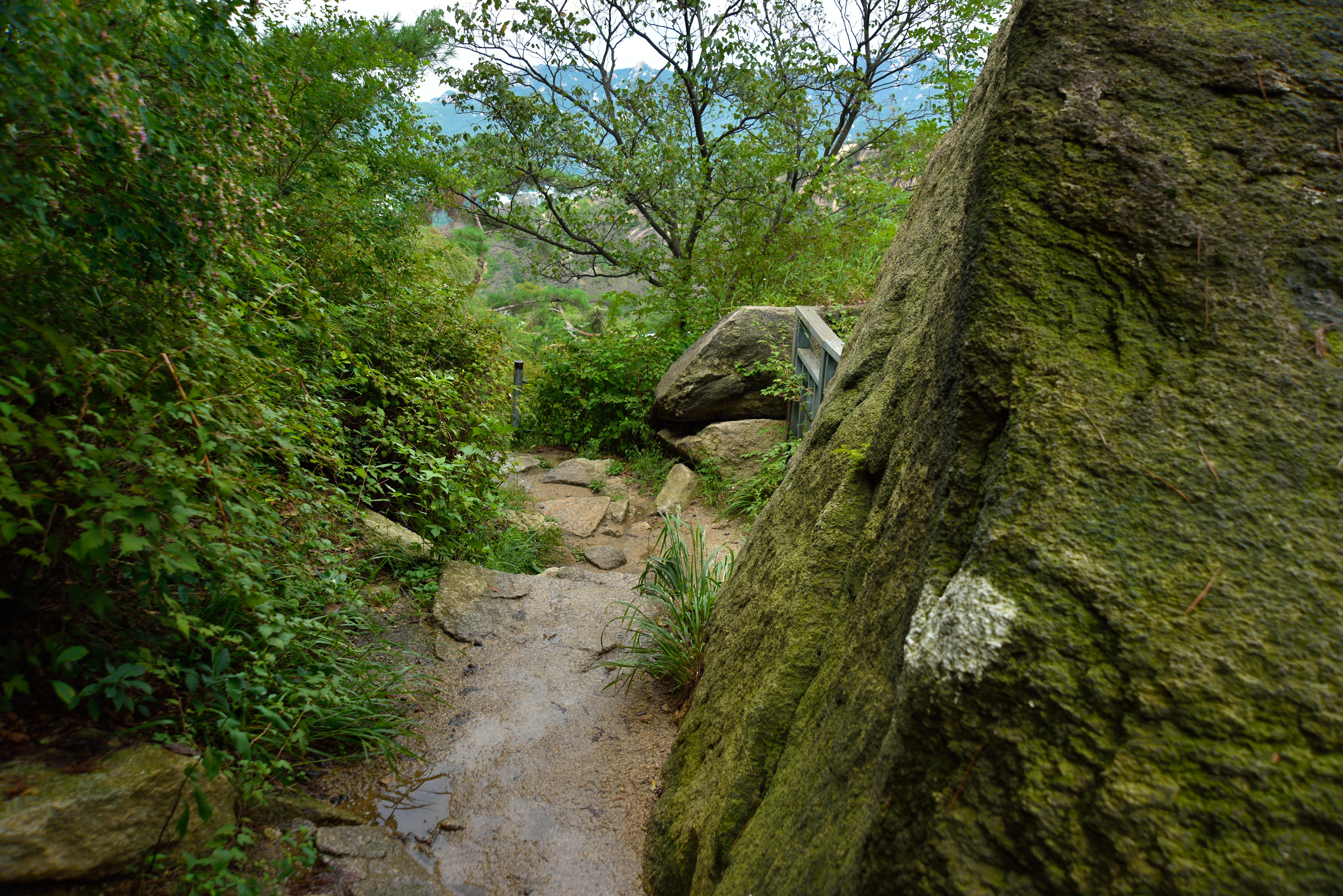 빗물에 바위사잇길 질척거려 미끄러웠다.