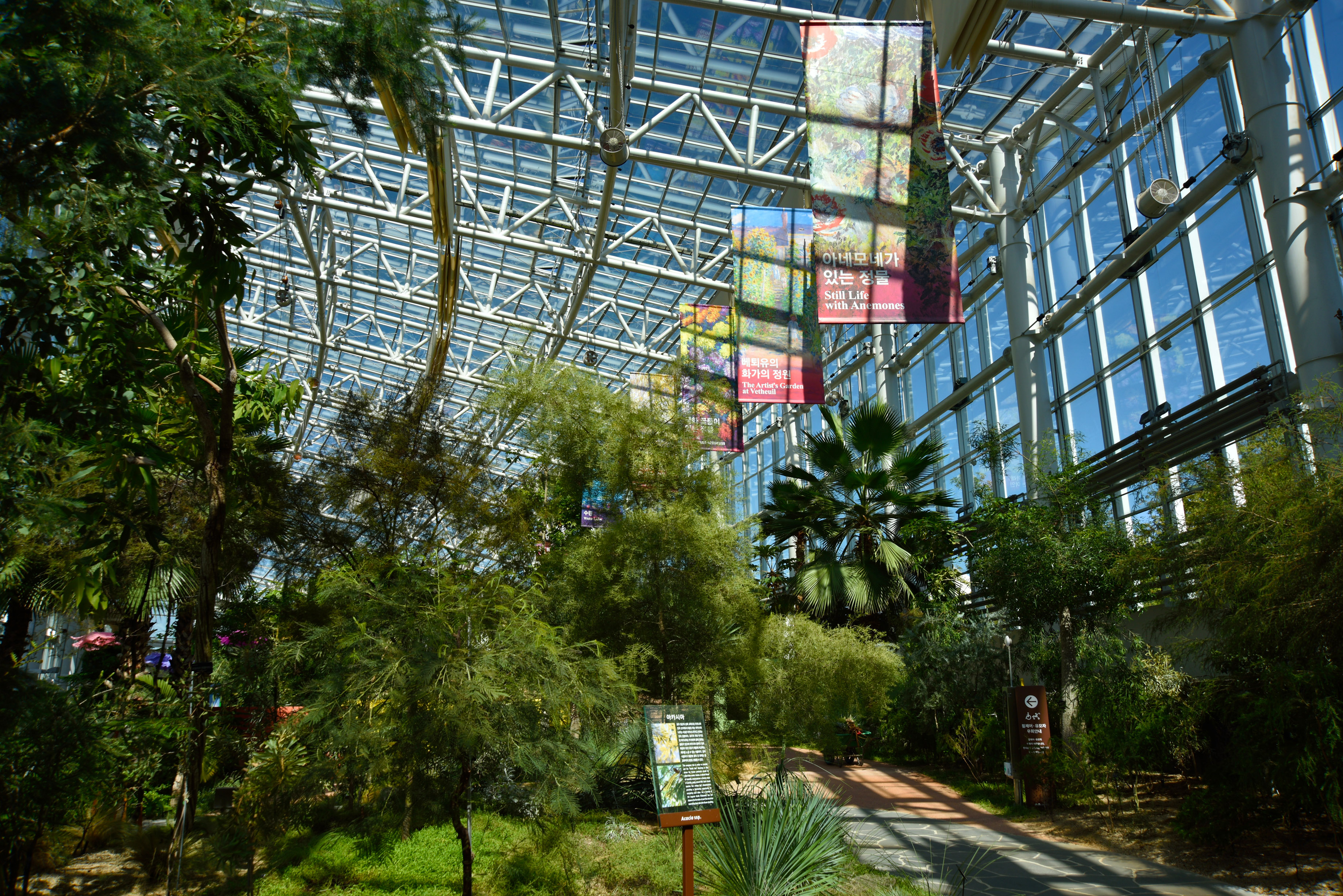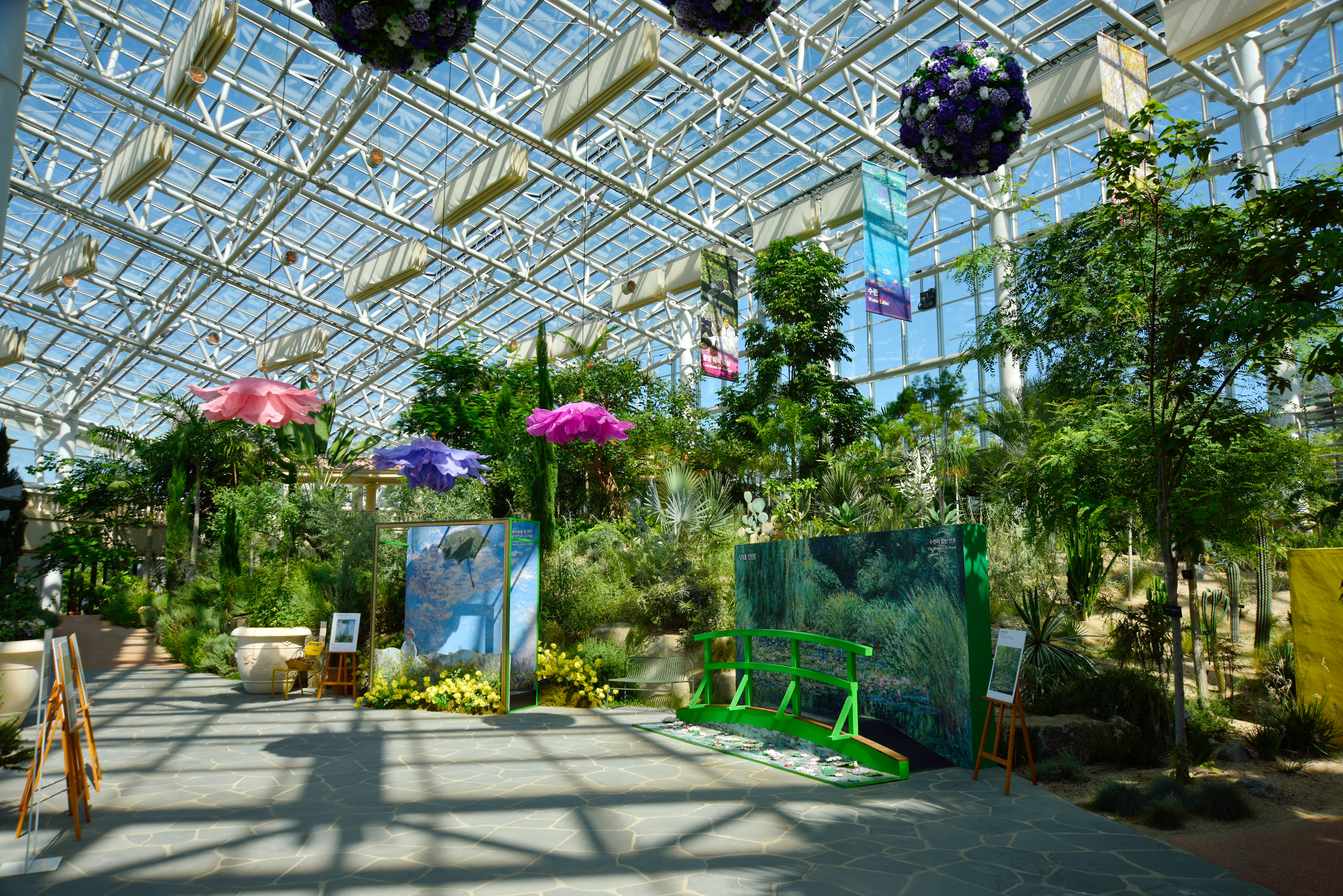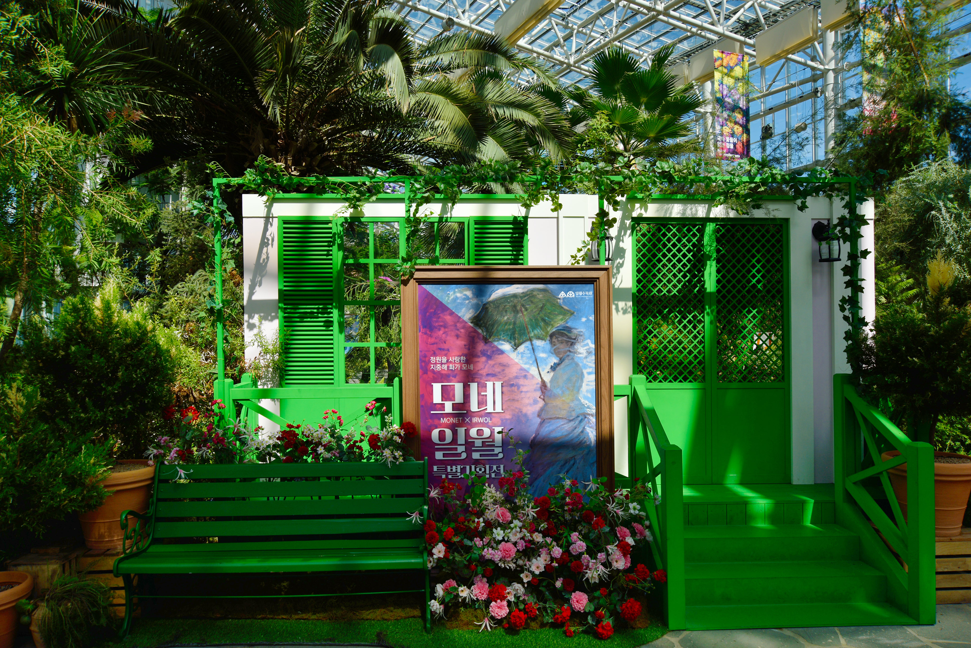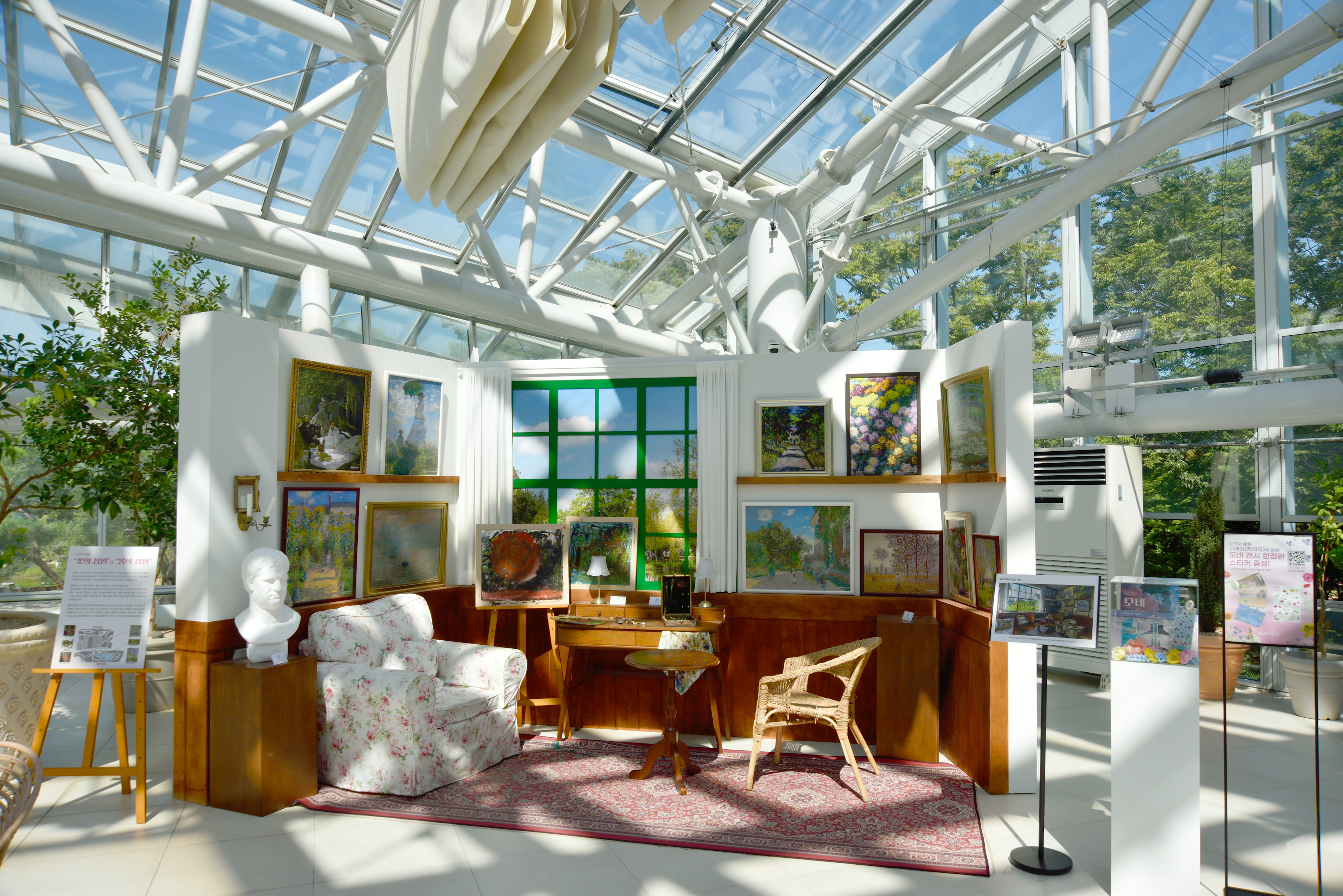 온실 안 전시 안내, 모네 특별 기획전이라는데, 모네와 무슨 연결점이 있는지 생뚱맞은 느낌이었다. 미술 전시회도 아니고, 모네 그림을 복사한 몇 점의 그림들과 현수막들이 온실 안 풍경과 전혀 어울려 보이지 않았다.