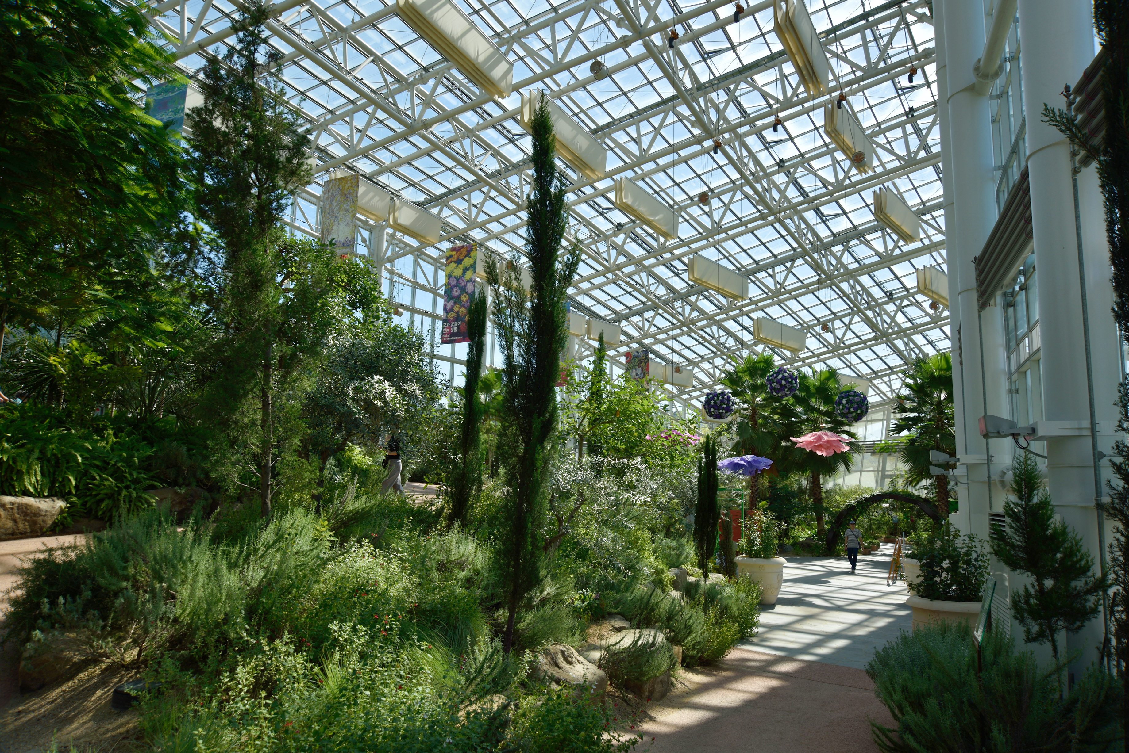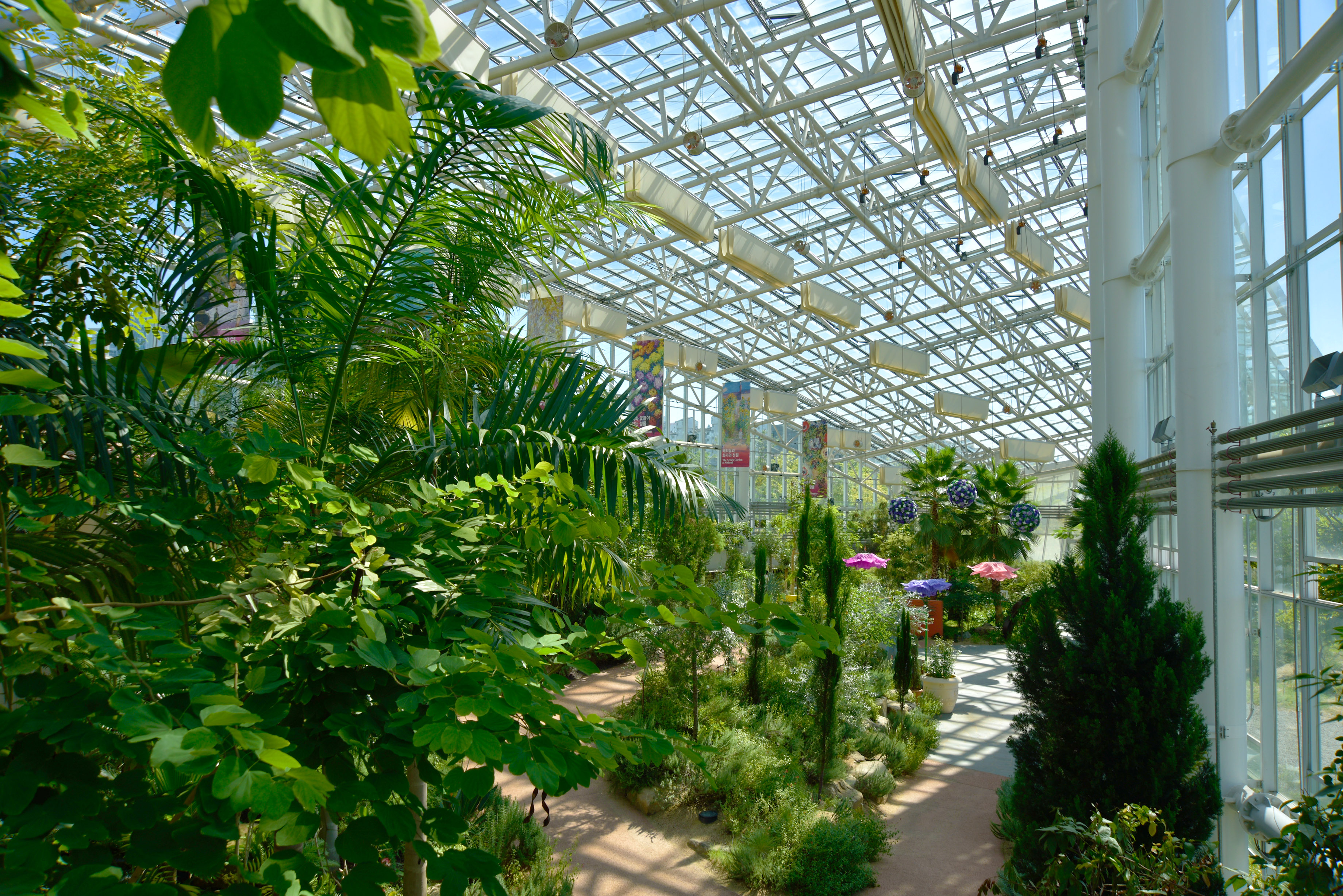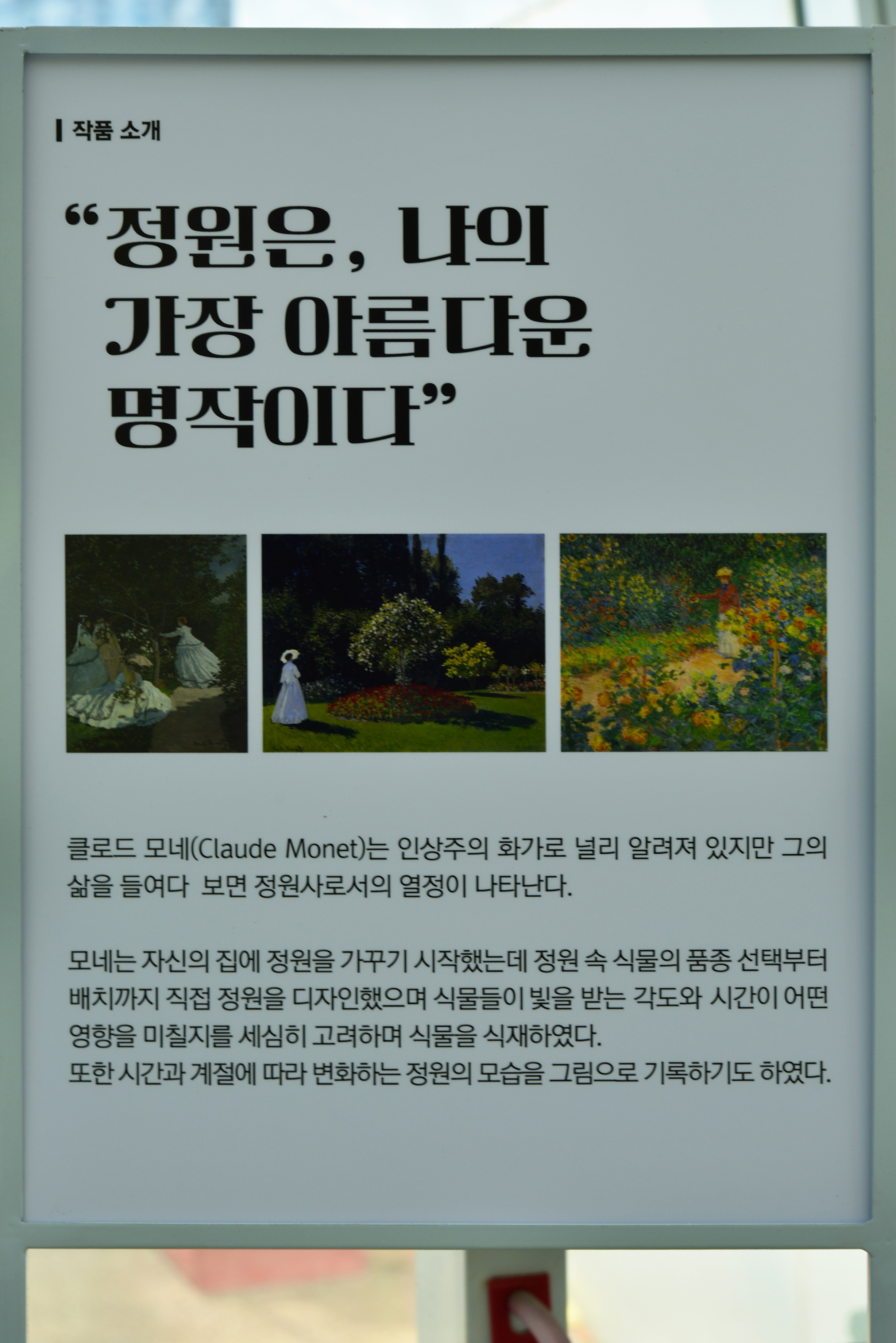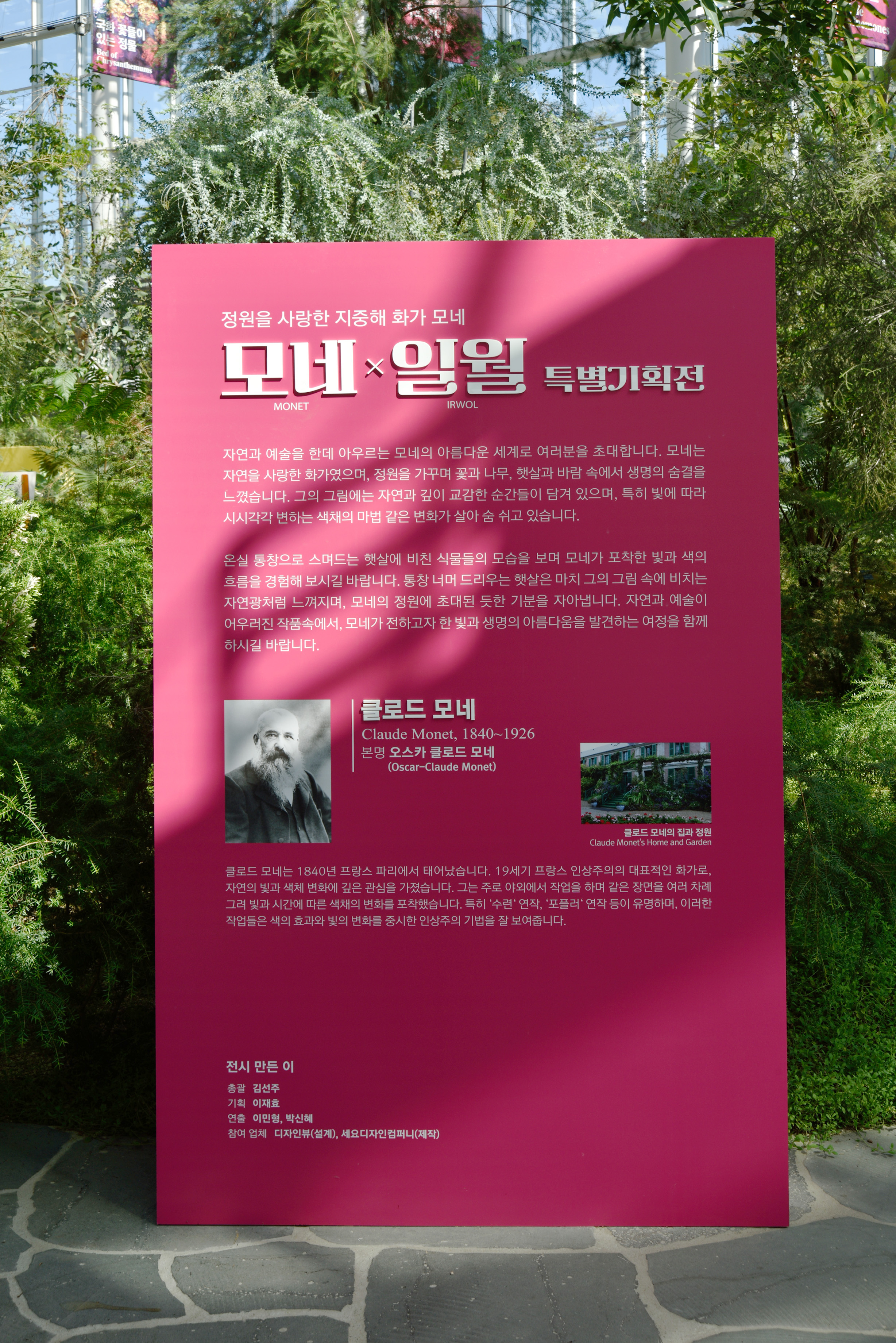 온실 안 전시 안내, 모네 특별 기획전이라는데, 모네와 무슨 연결점이 있는지 생뚱맞은 느낌이었다. 미술 전시회도 아니고, 모네 그림을 복사한 몇 점의 그림들과 현수막들이 온실 안 풍경과 전혀 어울려 보이지 않았다.