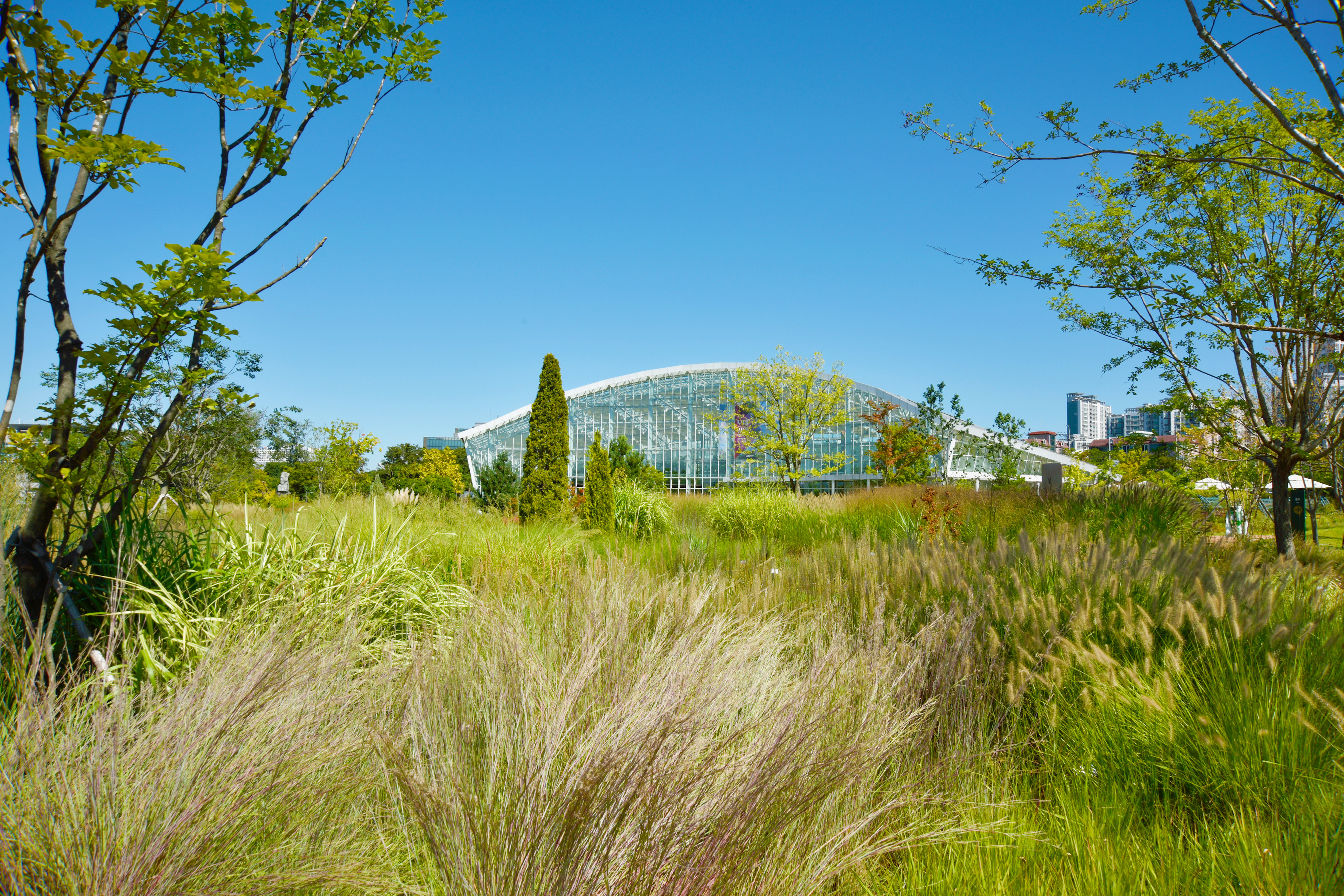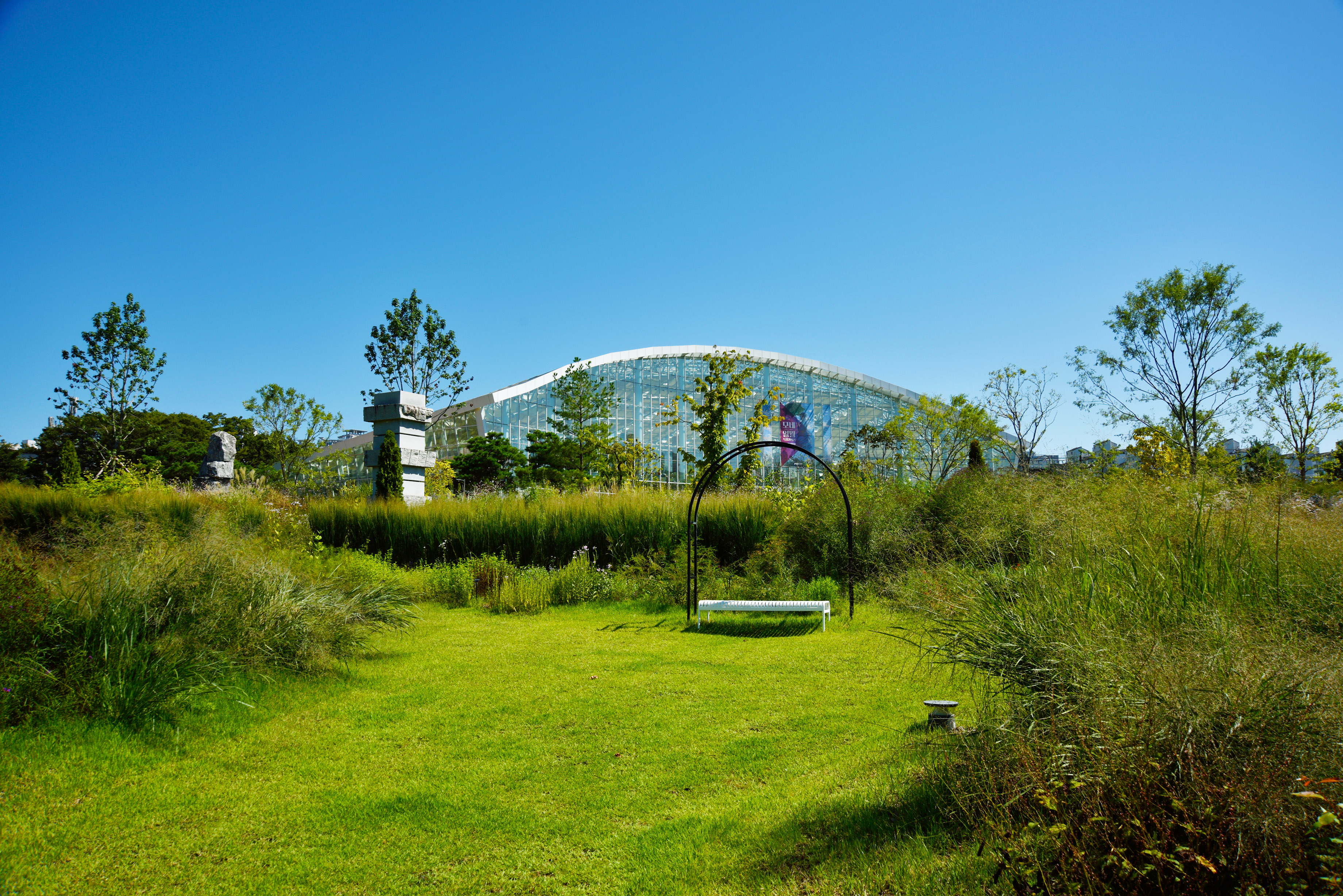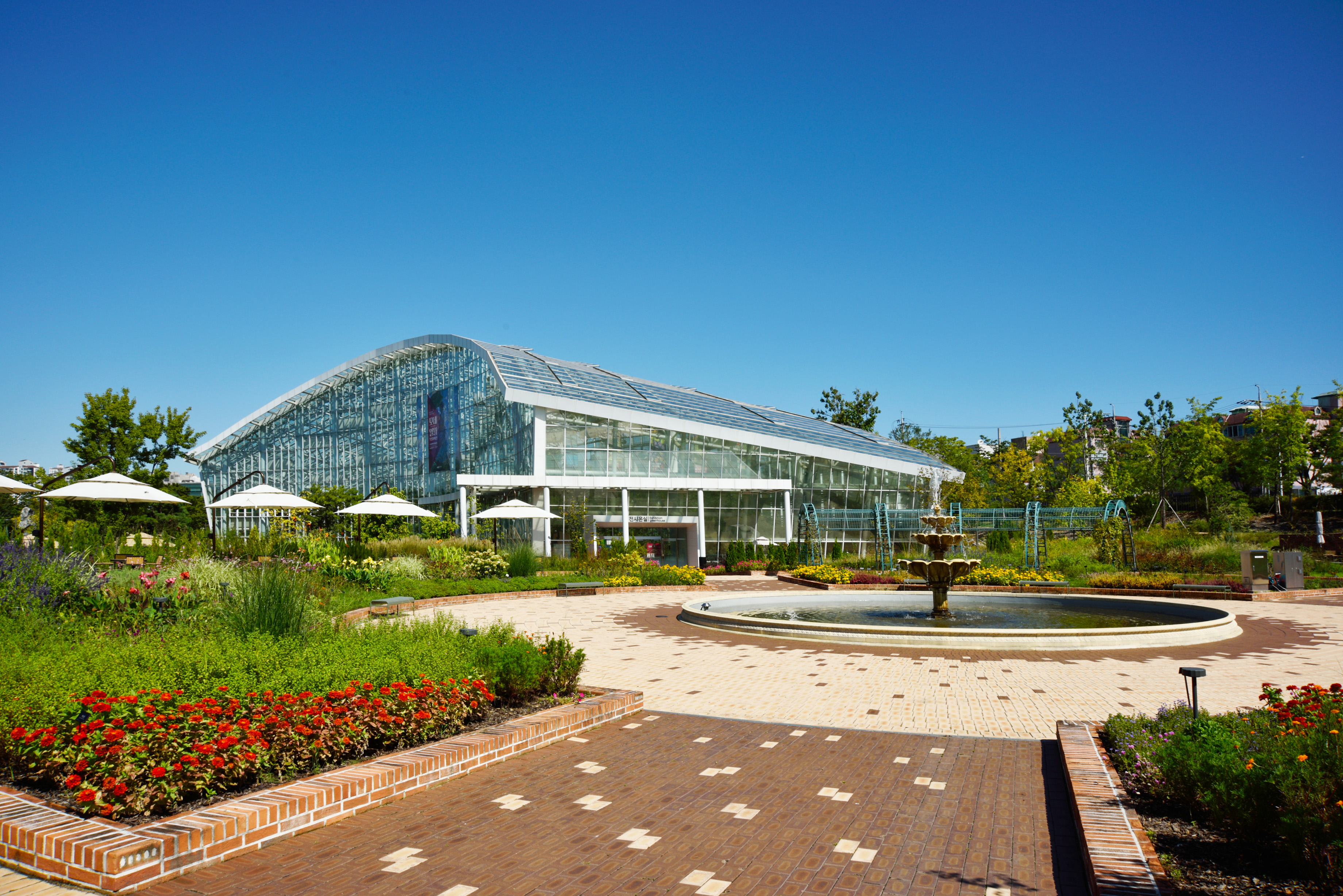 방문자 센터 바로 아래 수목원 온실, 지중해풍 분수가 아담한 모습으로 손님을 맞았다.