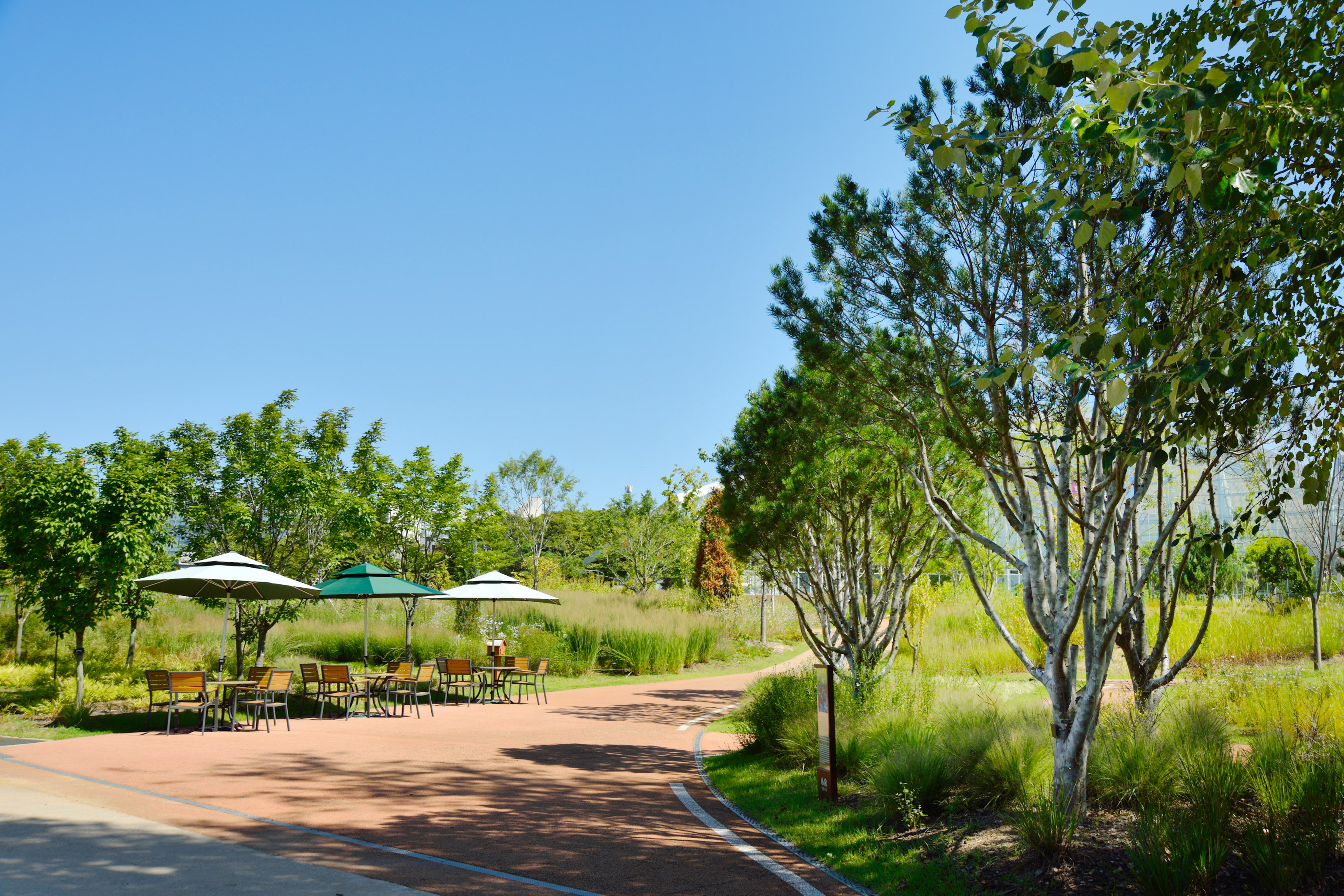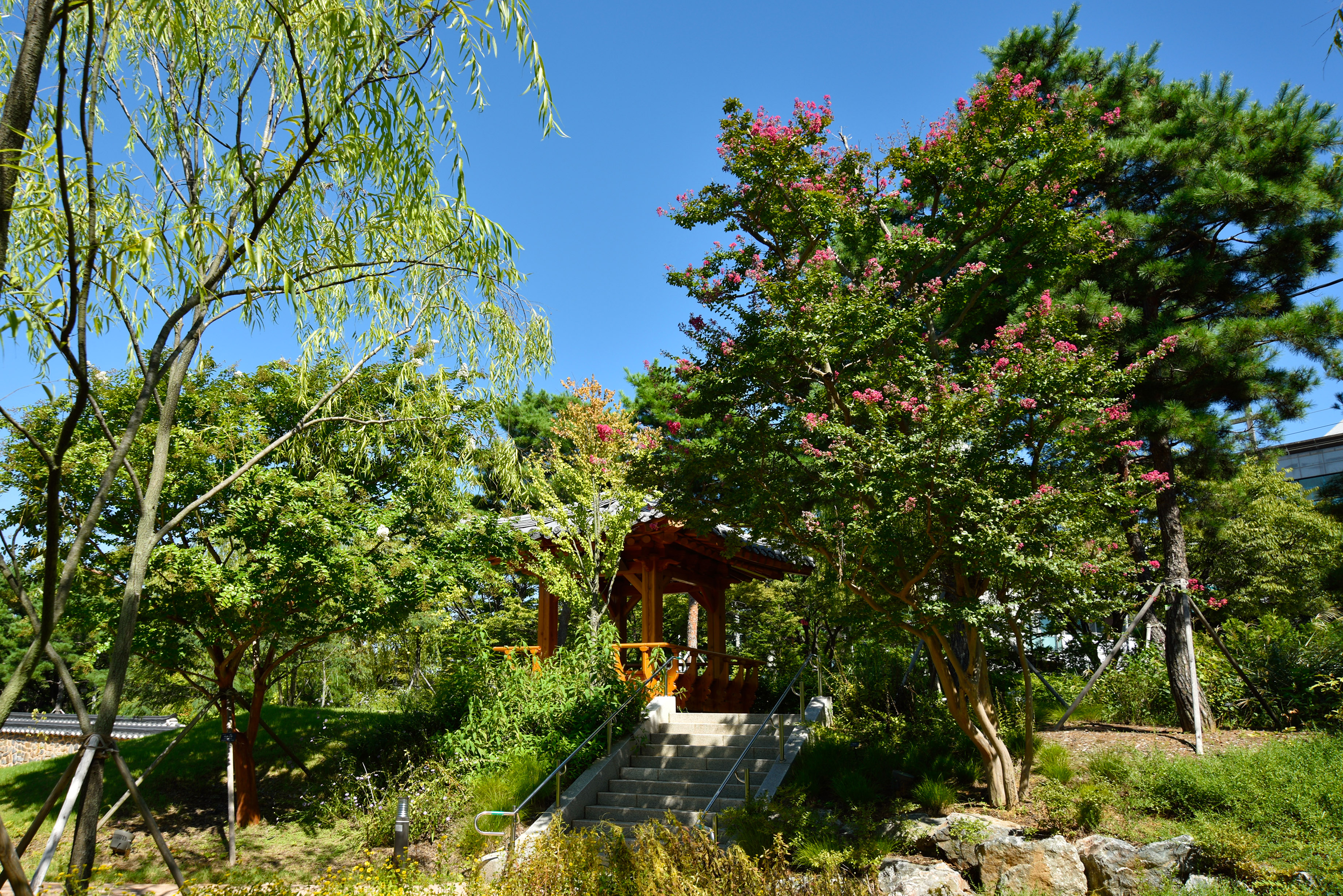 오른쪽에 식재된 백송 몇 그루